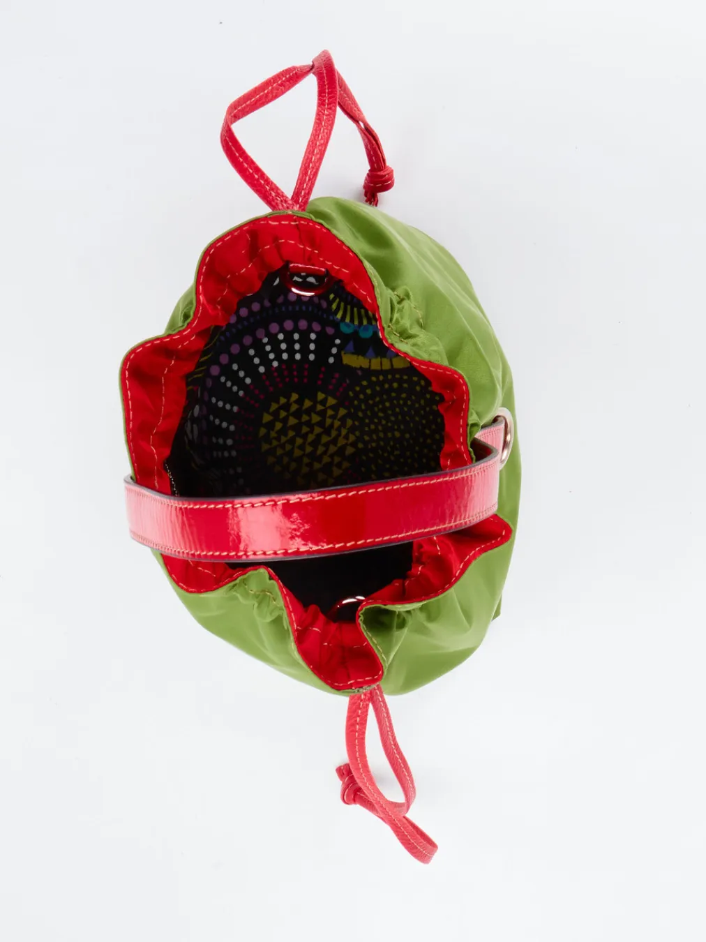 Dass simples, praktisches Design voll auf der modischen Höhe der Zeit sein kann, beweist dieser Matchbeutel der italienischen Marke AU79. In einem frischem Grasgrün gehalten, wirkt das strapazierfähige Textilmaterial wasser- und schmutzabweisend und kann einfach gereinigt werden. Ein interessanter farblicher Kontrast ergibt sich durch die knallroten Kalblederriemen. Diese fungieren sowohl als Zugband als auch als Handgriff und abnehmbarer Schultergurt, sodass der Matchbeutel sich in Sekundenschnelle von einer Umhängetasche in ein freches Unterarm-Accessoire verwandeln lässt. Im Inneren mit seinen bunten Retro-Mustern findet sich neben viel Stauraum auch ein Reißverschlussfach, das zusätzliche Sicherheit vor Diebstahl bietet. – Obermaterial: Textil, Kalbleder – Futter: Textil – Farbe: Grün, Rot – Größe: ca. 22 x 26 x 11 cm (H x B x T) – Schulterriemen: ca. 120 cm, verstell-und abnehmbar – Verschluss: Zugband – Innen: ein Hauptfach, ein Reißverschlussfach