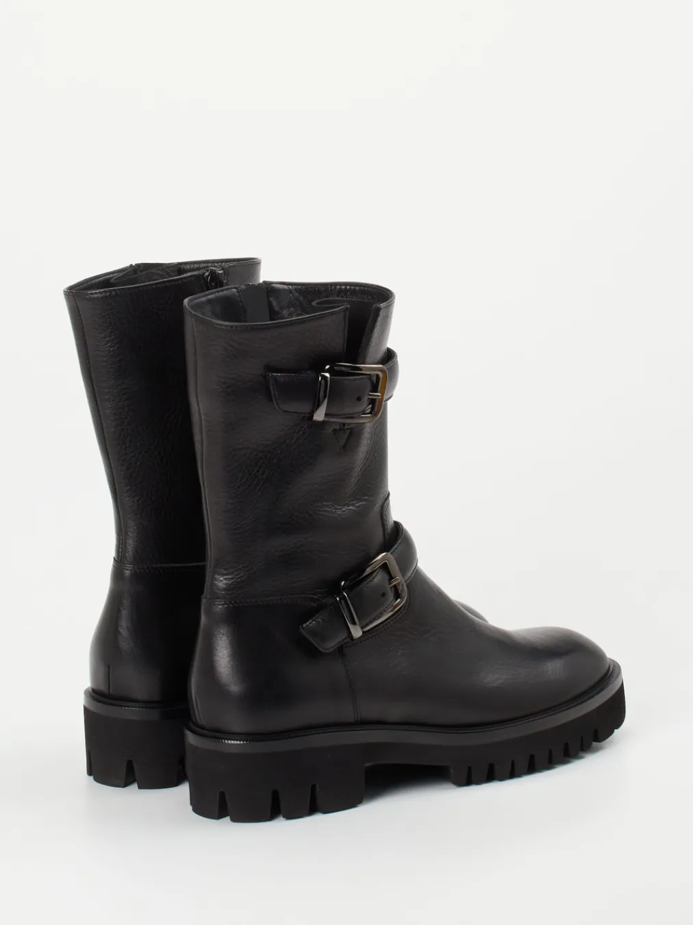 Ideal für Alltag, Stadtspaziergänge oder Wochenendtrips: Das schwarze Kalbleder zeigt sich in einer Kombination aus glatter und leicht genarbter Struktur. Gunmetal-farbene Metallschnallen setzen rockige Akzente, ergänzt durch einen praktischen Reißverschluss. Die profilierte Gummisohle mit 4 cm Absatz liefert einen cleanen Utility-Charakter und sicheren Tritt. Der mittelhohe Schaft verleiht Stabilität und wirkt trotz Chunky-Design ausgewogen. Lammnappa-Futter und gepolstertes Fußbett sorgen dabei für nachhaltigen Tragekomfort.