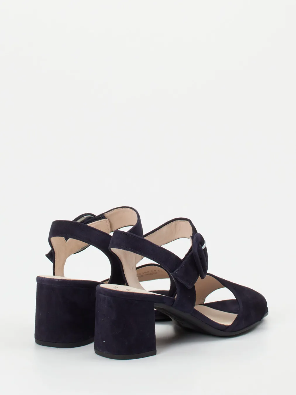 Diese dunkelblauen Sandalen überzeugen mit samtigem Veloursleder, schlichtem Ton-in-Ton-Design und angenehmer Absatzhöhe – ein stilvoller Begleiter für viele Anlässe.