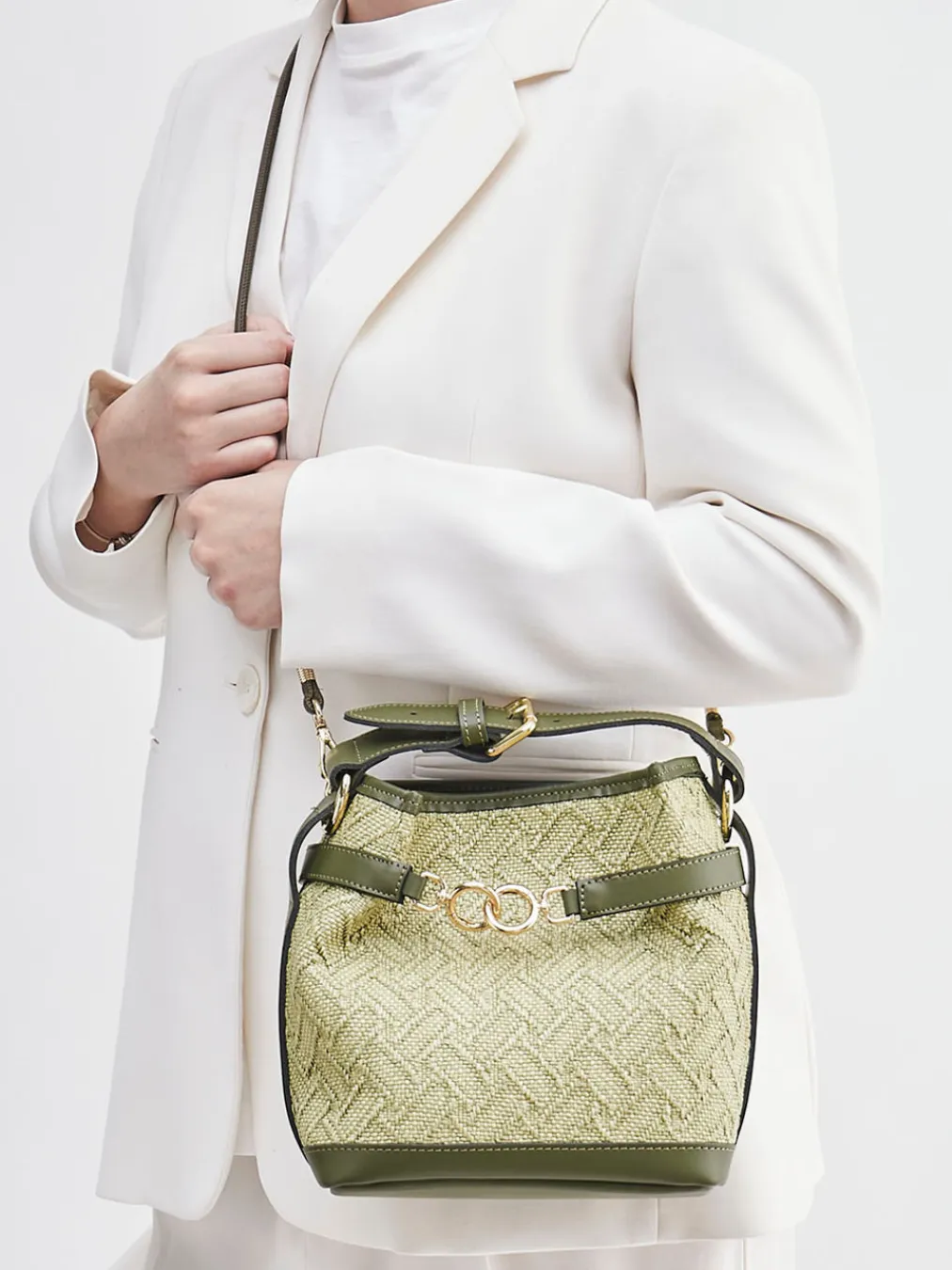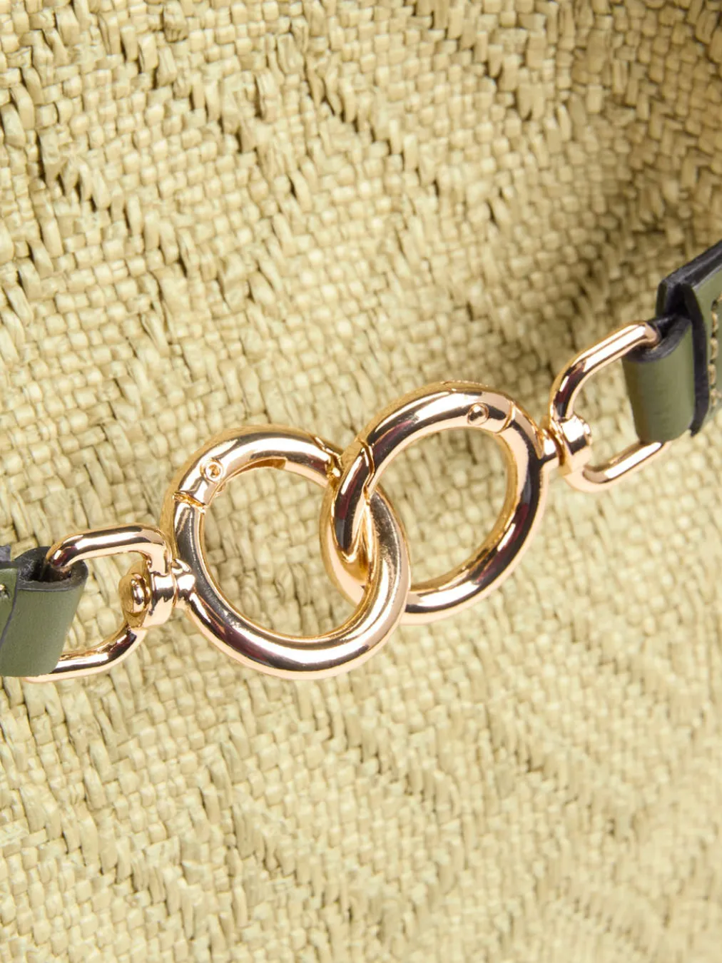 Ein gelungener Materialmix aus gewebtem Textil und Kalbleder in Naturtönen, kombiniert mit goldfarbener Hardware und moderner Silhouette – ein dezenter Blickfang für den Sommer.