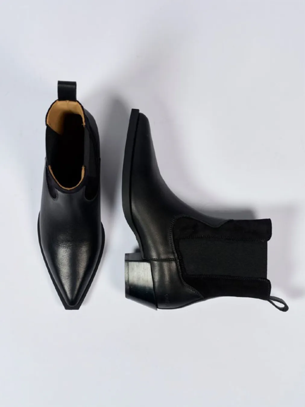Diese Copenhagen-Stiefelette überzeugt mit spitz zulaufender Form, feinem Glattleder und tonalen Elastikeinsätzen – ein stilvolles Bekenntnis zu Minimalismus mit Western-Akzent.