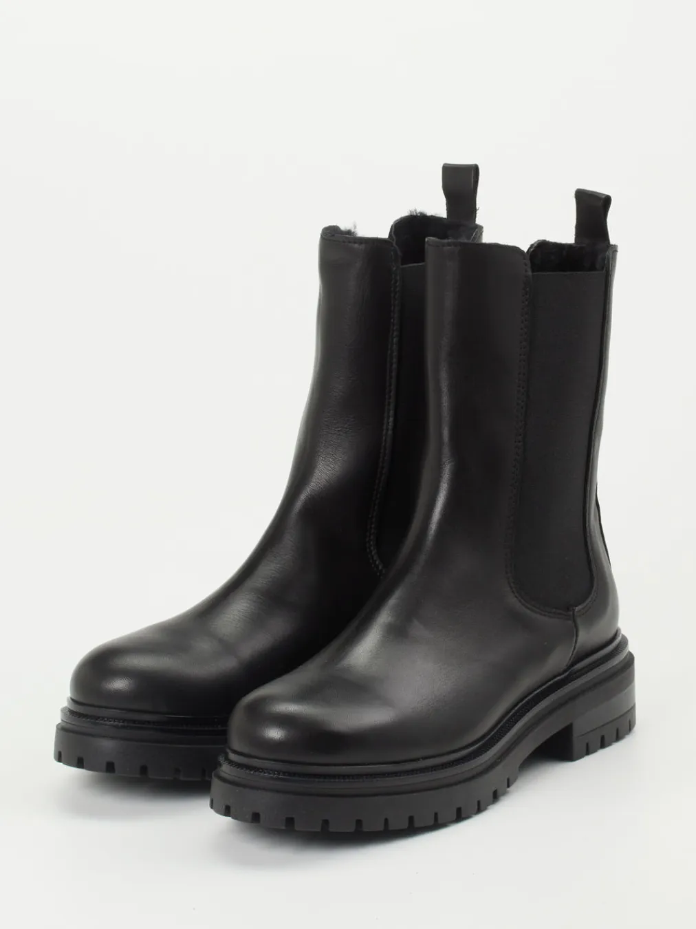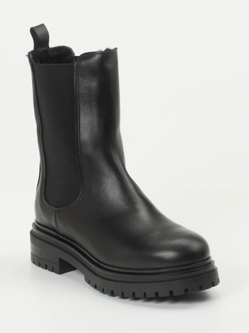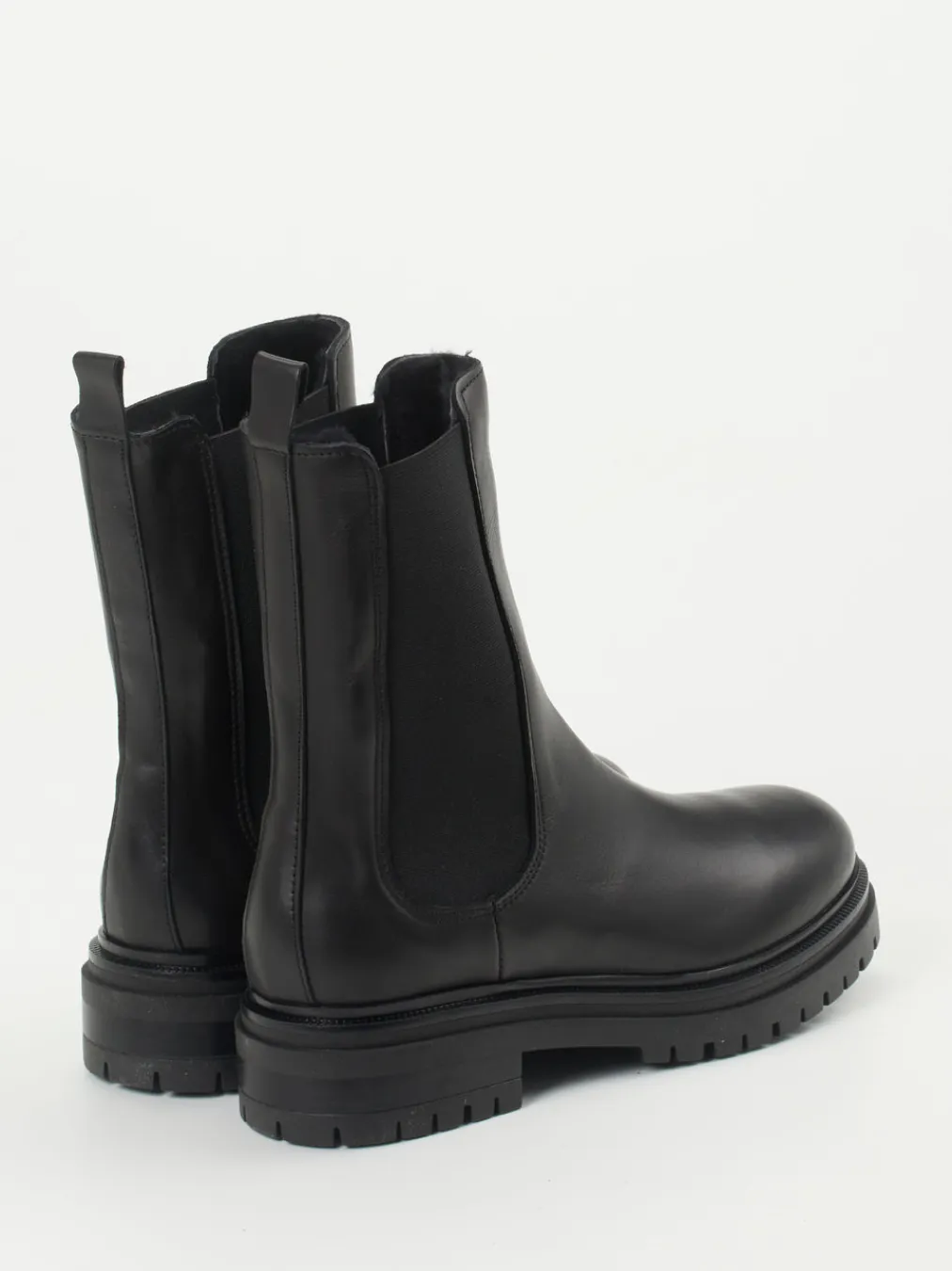 Gefertigt aus feinem Kalbleder mit matter Oberfläche vereinen die Boots Komfort und Purismus. Markante Elastikeinsätze und eine Zuglasche erleichtern den Einstieg, während das flauschige Lammfellfutter angenehme Wärme spendet. Die schwere Gummisohle mit betontem Profil garantiert Trittsicherheit und interpretiert das klassische Design urban-modern. In Kombination mit minimalistischen Outfits entfaltet der Schuh seinen vollen Reiz.