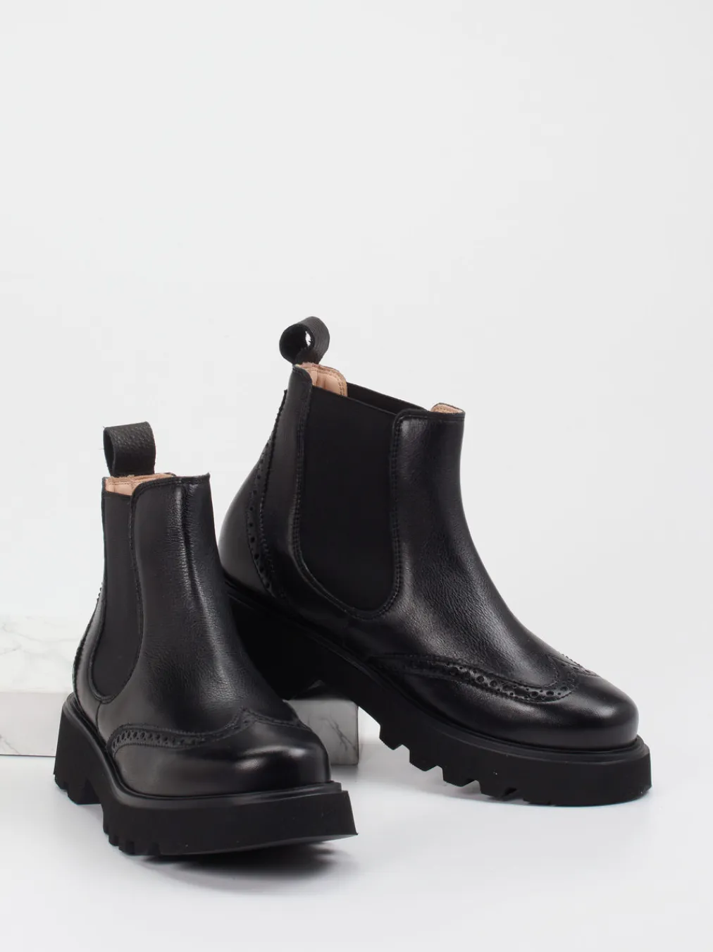 Herbststiefel mit Stilpotenzial.Die Marke Werner präsentiert mit diesen Chelsea Boots ein Modell für Damen, das gekonnt Tradition und urbanen Zeitgeist verbindet. Ideal für moderne Alltagslooks bei wechselhaftem Wetter: Gefertigt aus schwarzem Kalbleder mit genarbter Oberfläche, zeigen diese knöchelhohen Stiefeletten subtile Brogue-Verzierungen und eine markant profilierte Sohle – beide Ton-in-Ton gehalten. Seitliche Elastikeinsätze sorgen für bequemen Einstieg, eine Zuglasche hinten ergänzt das funktionale Design. Durch ihre kompakte Form und klare Linienführung bieten sie vielfältige Kombinationen von Streetwear bis Bürooutfit. Der aktuelle Chunky-Sole-Trend trifft hier auf Heritage-Elemente. Typisch Werner: Verlässliche Handwerkskunst in urbaner Formsprache.