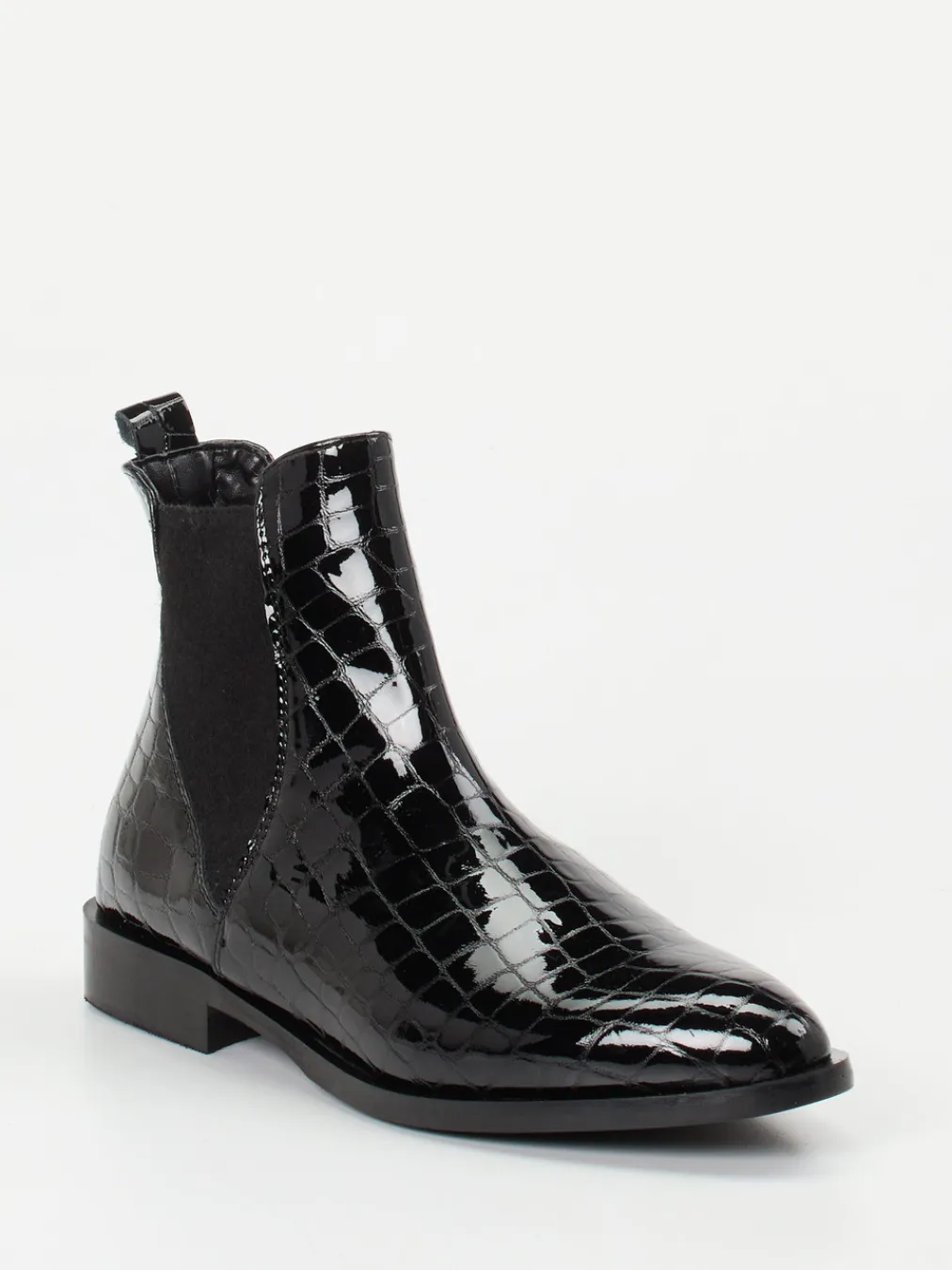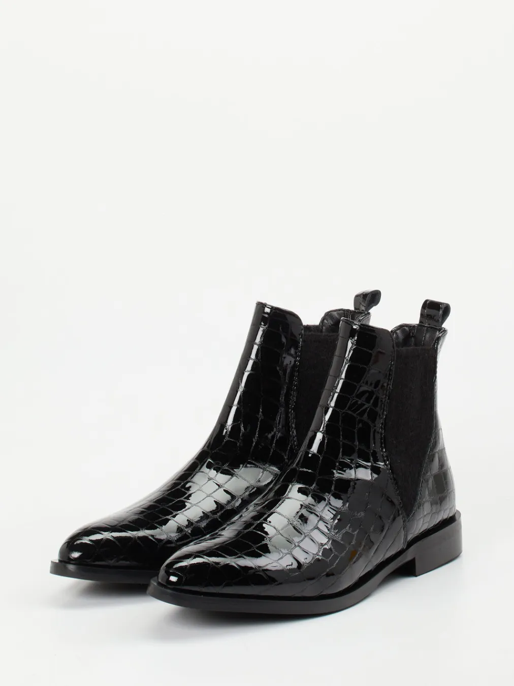 Die glänzenden Chelsea Boots von Andrea Puccini zeigen Lackleder in Kroko-Optik und verbinden Minimalismus mit femininer Raffinesse. Ideal für Business-Casual-Looks mit modernem Twist.
