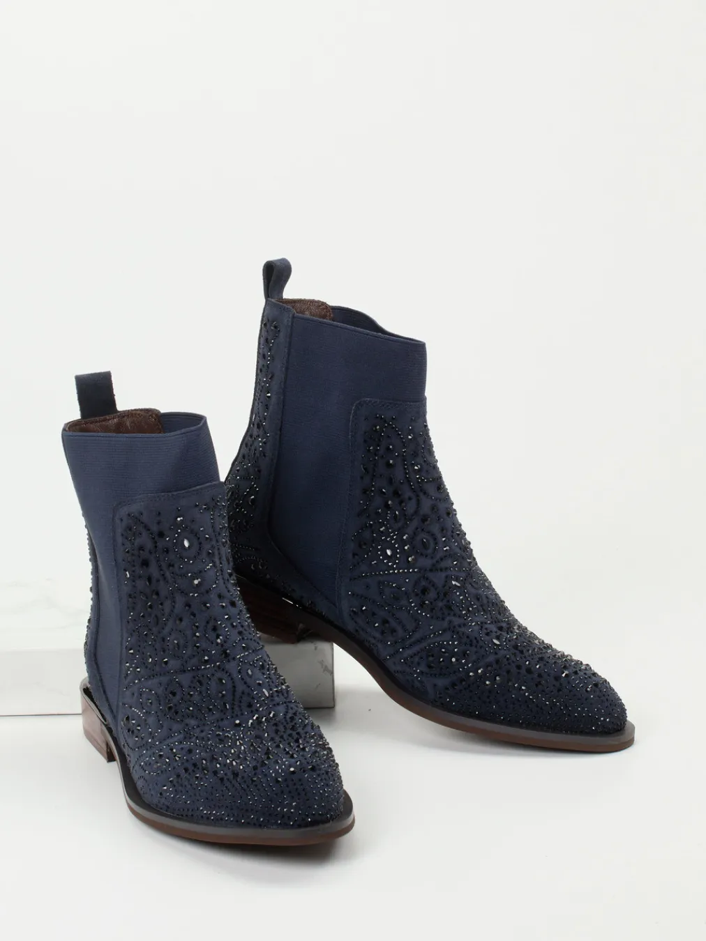 Das samtig strukturierte Veloursleder im klassischen Navy kommt durch filigran gesetzte Strassdetails besonders edel zur Geltung – eine moderne Neuinterpretation des Chelsea-Designs.