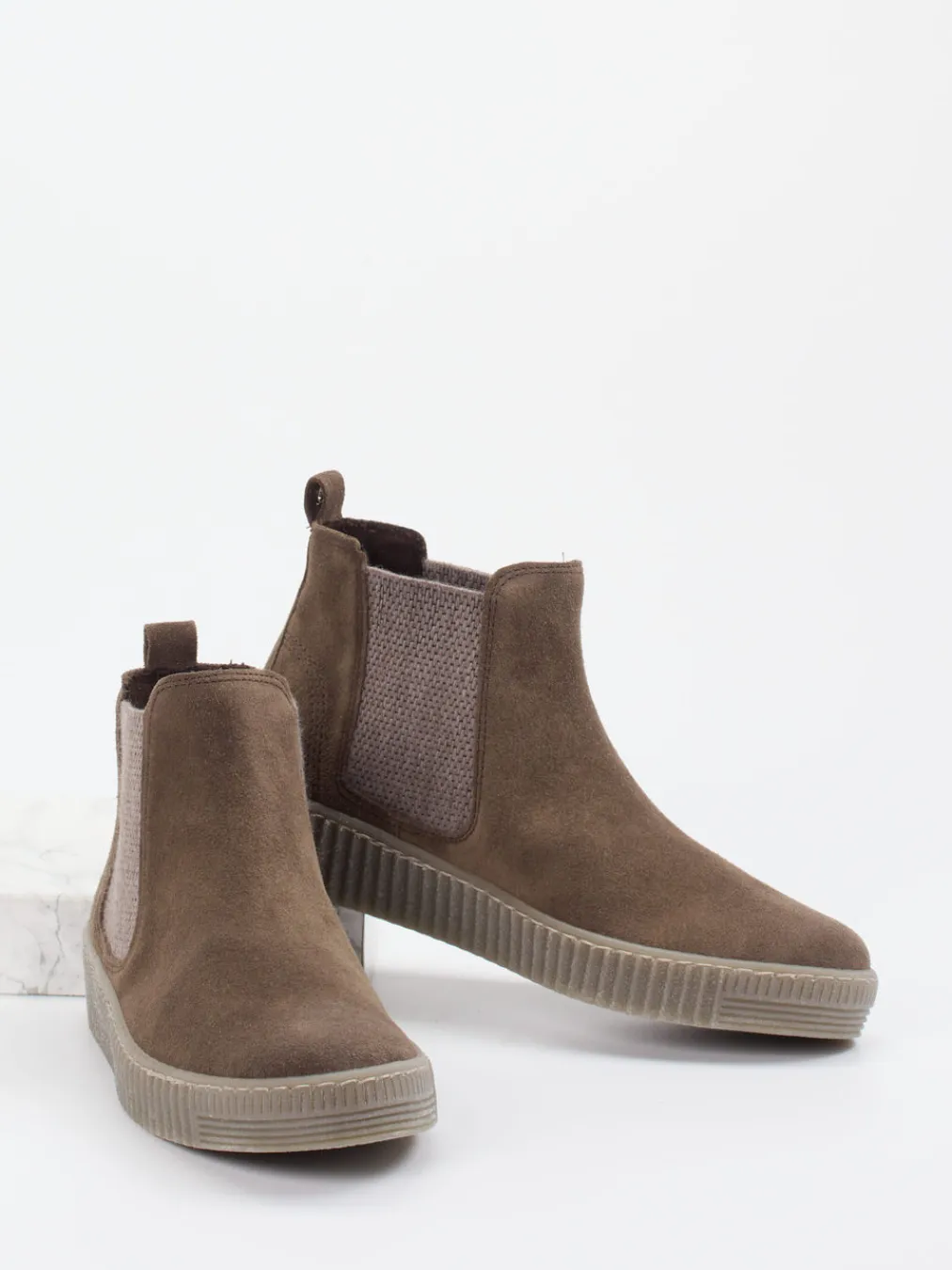 Urbaner Stil. Alltagskomfort mit Charakter.Gabor zeigt mit diesen Chelsea Boots eine stilsichere Damen-Stiefelette für die Herbst-Winter-Saison. Wenn es morgens schnell gehen muss, überzeugt die Schlupfform mit tonigen Elastikeinsätzen und rückseitiger Zuglasche. Das taupebraune Veloursleder verleiht dem Modell eine matte, besonders weiche Haptik. Knöchelhoch geschnitten und rund zulaufend, bildet die strukturierte Gummisohle mit feinem Profil ein griffiges Fundament – ideal für City und Büro. Dezente Färbung und klare Linien prägen den minimalistischen Look im Tonal-Dressing-Trend. Kombiniert mit High-Waist Jeans und Strick wird der Stil komplett. Ein Gabor-Schuh, der Funktionalität mit lässiger Ästhetik verbindet.