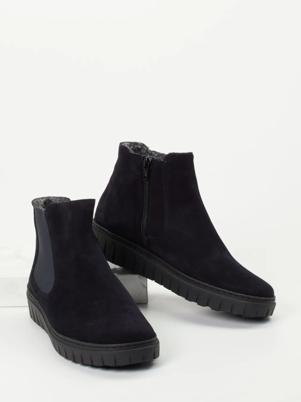 Minimalistisch, warm und stilbewusst.Die Marke Semler präsentiert eine Chelsea-Stiefelette für Damen, die sich durch klare Linien und hohe Alltagstauglichkeit auszeichnet. Ob beim Stadtbummel oder für entspannte Stunden zu Hause – das matte, dunkelblaue Veloursleder liegt samtig weich am Fuß und harmoniert mit dem tonigen Elastikeinsatz und dem dezenten Innenreißverschluss. Kuscheliges Teddy-Futter aus Textilfaser sorgt für angenehme Wärme, während die rutschfeste Gummisohle mit markantem Profil sicheren Tritt auf winterlichem Untergrund verleiht. Die knöchelhohe, rund zulaufende Silhouette passt perfekt zum entspannteren Quiet Luxury-Trend. Ein Wechselfußbett unterstützt individuell. Semler steht für durchdachten Komfort mit urbaner Eleganz in jeder Jahreszeit.
