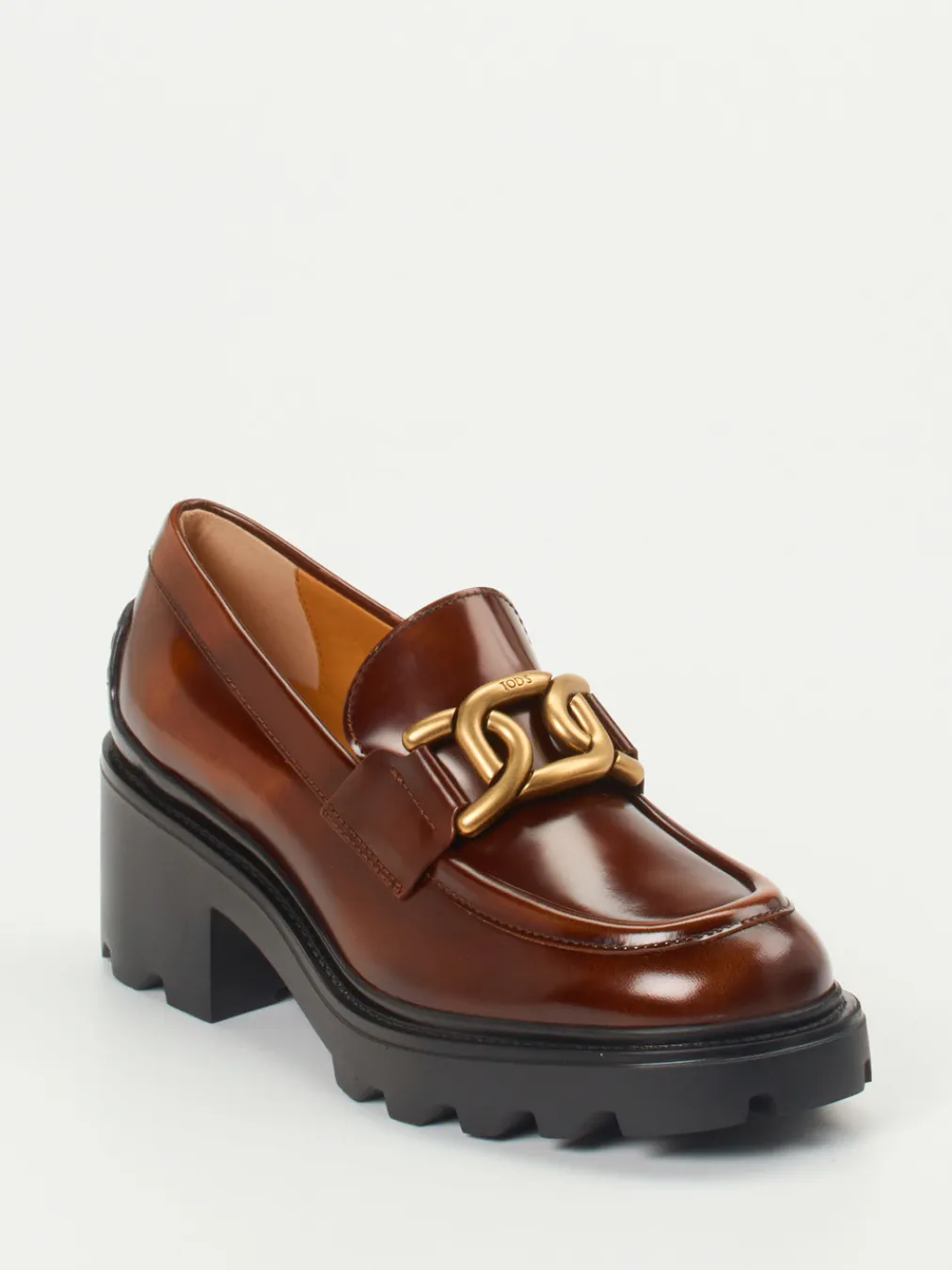 Dieser Chunky Loafer von Tod’s kombiniert glanzvolles Kalbleder mit einer auffälligen Profilsohle und goldfarbener Gliederkette – ein stilvolles Statement zwischen Minimalismus und Streetwear.