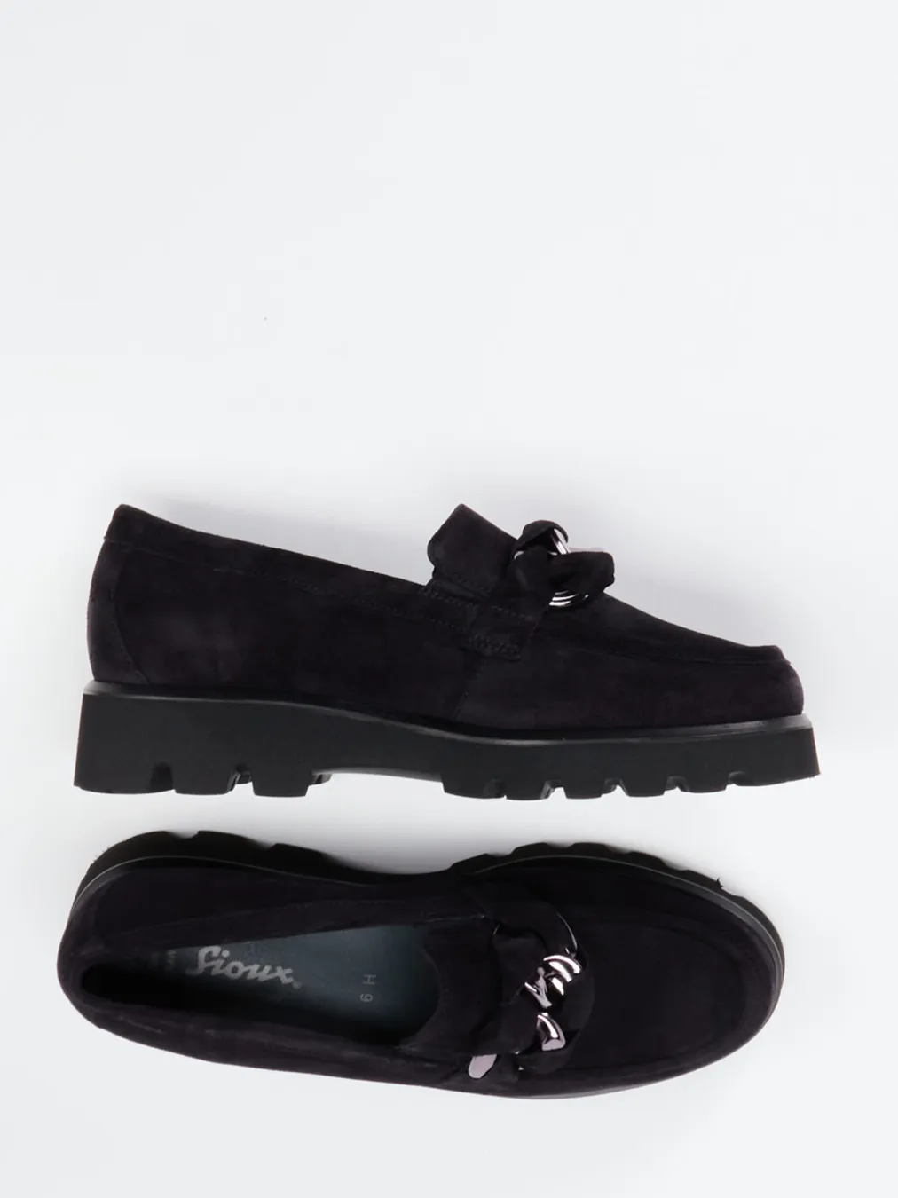 Minimalismus trifft Profil.Sioux präsentiert einen modischen Trotteur für Damen im Chunky-Loafer-Stil. Ideal für dynamische Alltagsmomente von Büro bis Freizeit: Das tiefschwarze Veloursleder, samtig angeschliffen, wird durch eine dekorative Metallkette auf der Spange stilvoll akzentuiert. Der bequeme Schlupfschuh bietet mit gepolstertem, austauschbarem Fußbett und einer ausgeprägt profilierten Gummisohle Komfort und Halt. Die klassische Silhouette in Kombination mit der klobigen Sohle macht den Schuh zu einem Statement moderner Streetwear mit minimalistischer Prägung. Besonders gut kombinierbar mit cropped Jeans und Oversize-Blazer. Ein eleganter Allrounder mit Profil – für stilvolle Lässigkeit im Alltag.