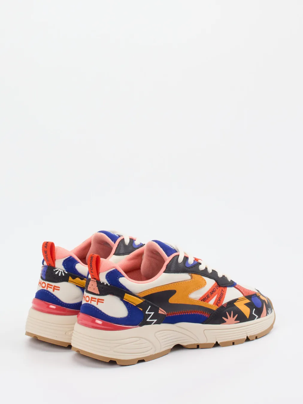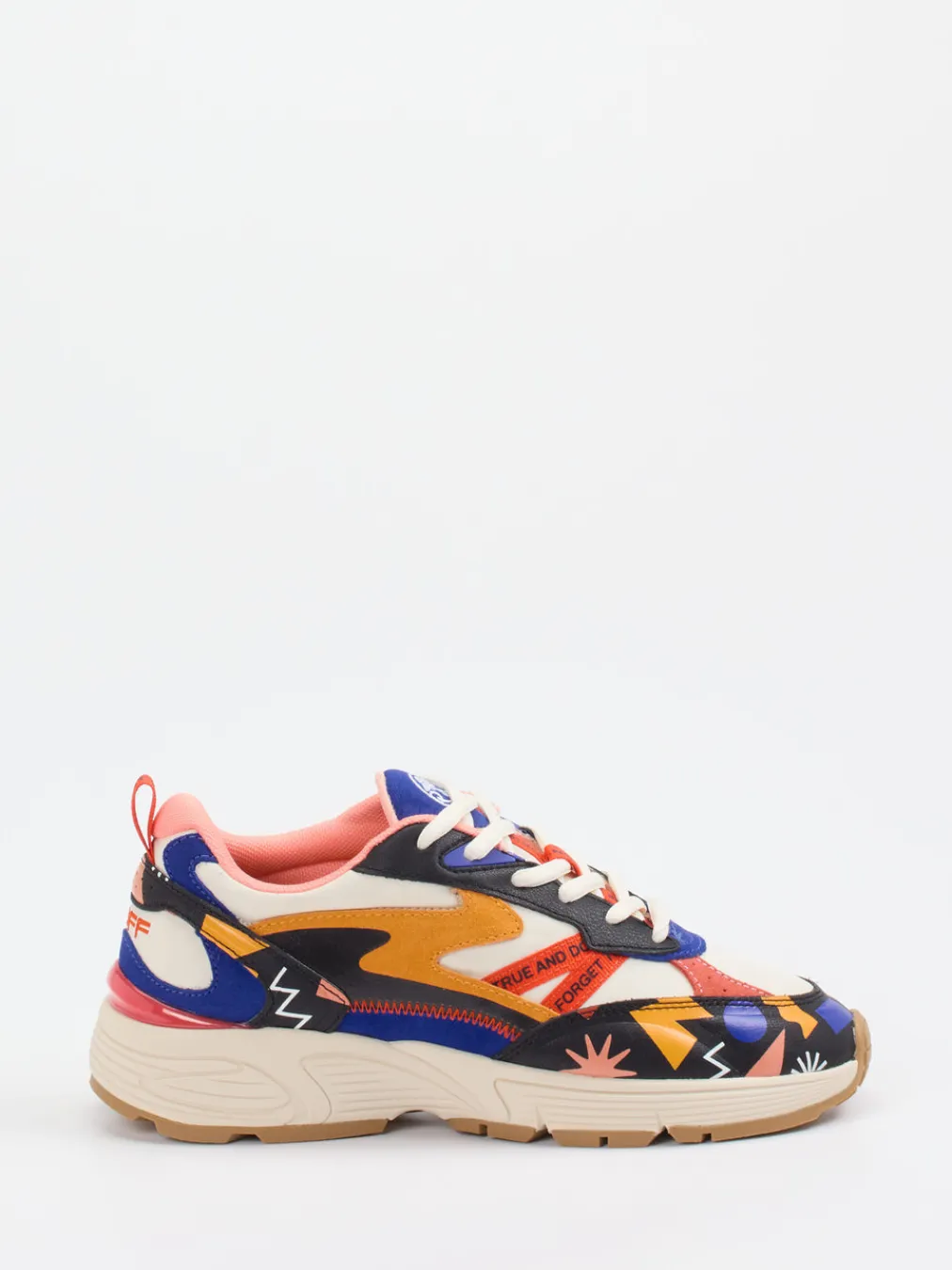 Ideal für trendbewusste Alltagsszenarien punktet der Unisex-Sneaker mit einem innovativen Materialmix aus Kalb- und Veloursleder sowie Nylon. Die matte Oberfläche mit Grafikmuster in Beige, Schwarz, Kobaltblau und Orange wird durch rote Details und eine Zuglasche mit Schriftzug ergänzt. Seine voluminöse Silhouette, die mehrlagige Gummisohle und die atmungsaktive Mesh-Innenausstattung mit Memory-Foam sorgen für Komfort und urbanes Styling. Y2K-Ästhetik trifft auf expressive Formsprache – ideal für Streetwear-Enthusiast:innen.