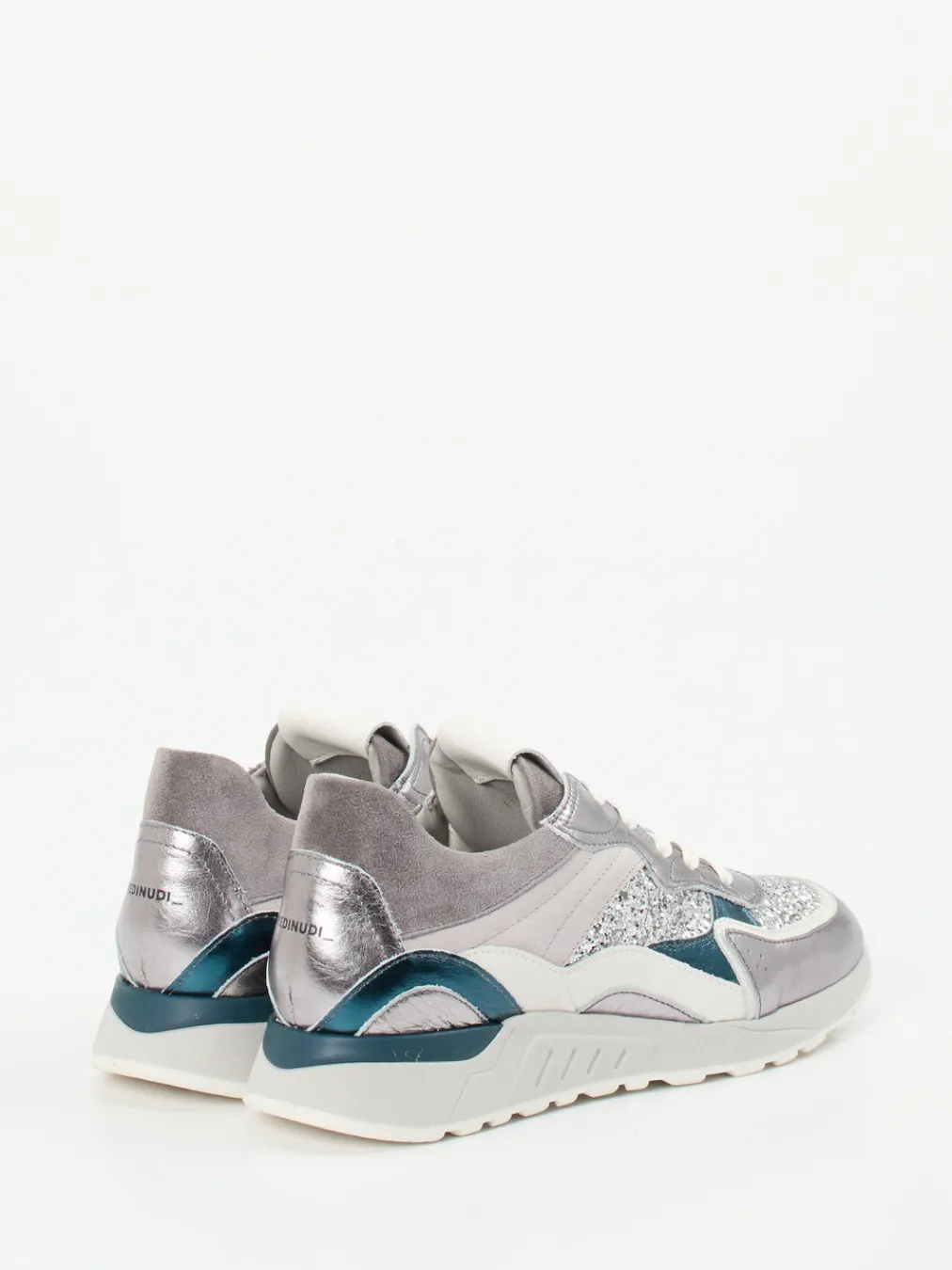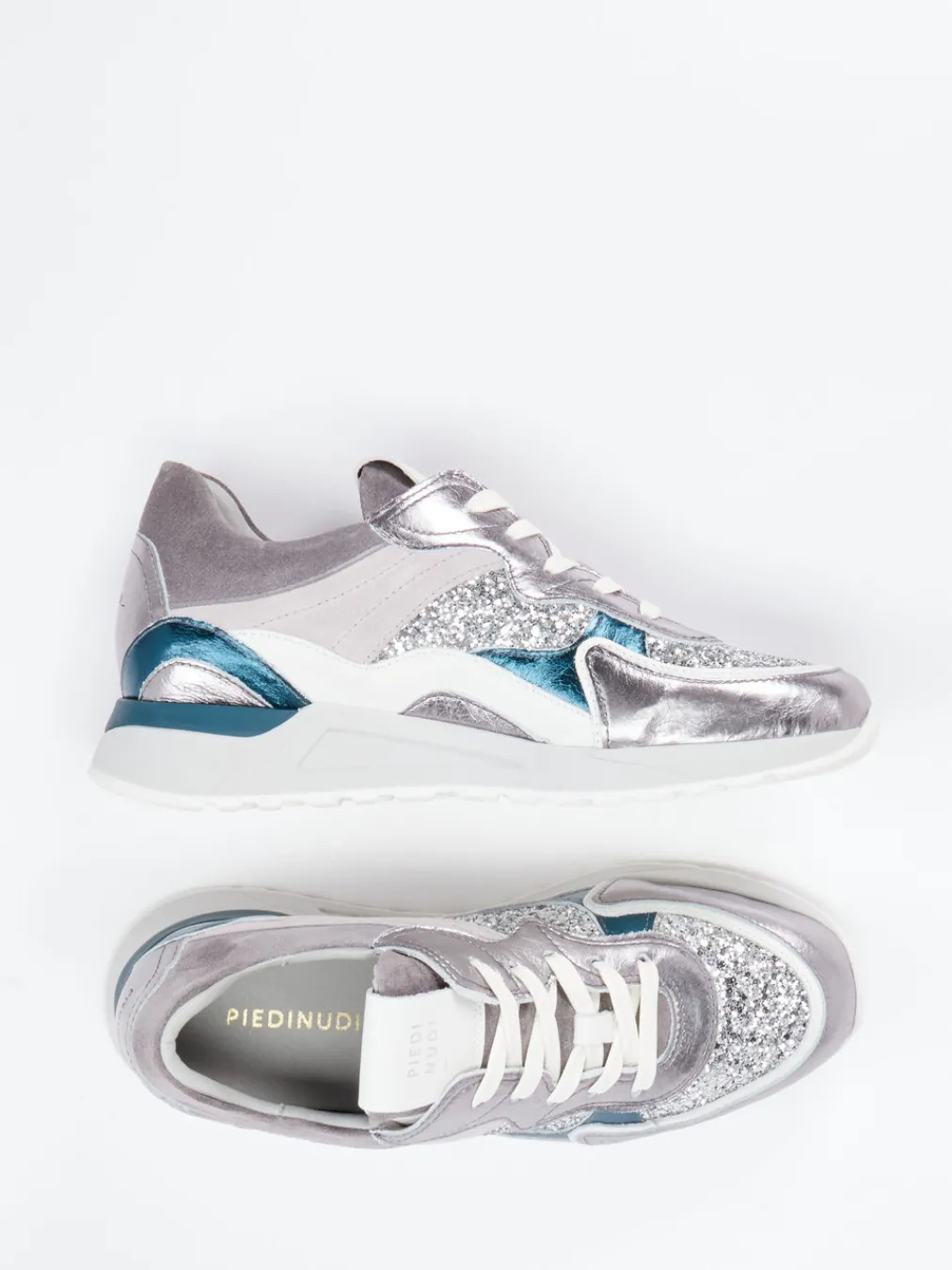 Statement mit Stil und Glanz.Piedi Nudi präsentiert einen Chunky Sneaker für Damen im topaktuellen Metallic-Look. Wenn ein sportlicher Auftritt mit urbaner Extravaganz gefragt ist, liefert dieses Modell die perfekte Antwort. Das hochwertige Metallicleder wird durch samtiges Veloursleder und Glitzertextil ergänzt und ergibt zusammen mit Mesh-Partien eine spannende Materialkomposition. Akzente in Silber, Hellgrau und Petrol unterstreichen die markante chunky Retro-Silhouette. Schnürung, gepolsterte Zunge und eine rutschfeste Gummisohle sorgen für Funktionalität im Alltag. Der Sneaker passt hervorragend zu Streetwear-Looks oder Y2K-inspirierten Outfits. Trendiger Look und bequeme Passform in bewährter Piedi Nudi Qualität.