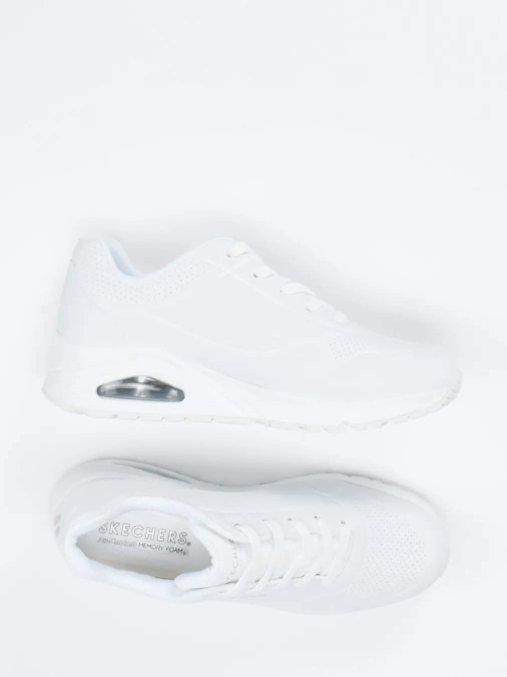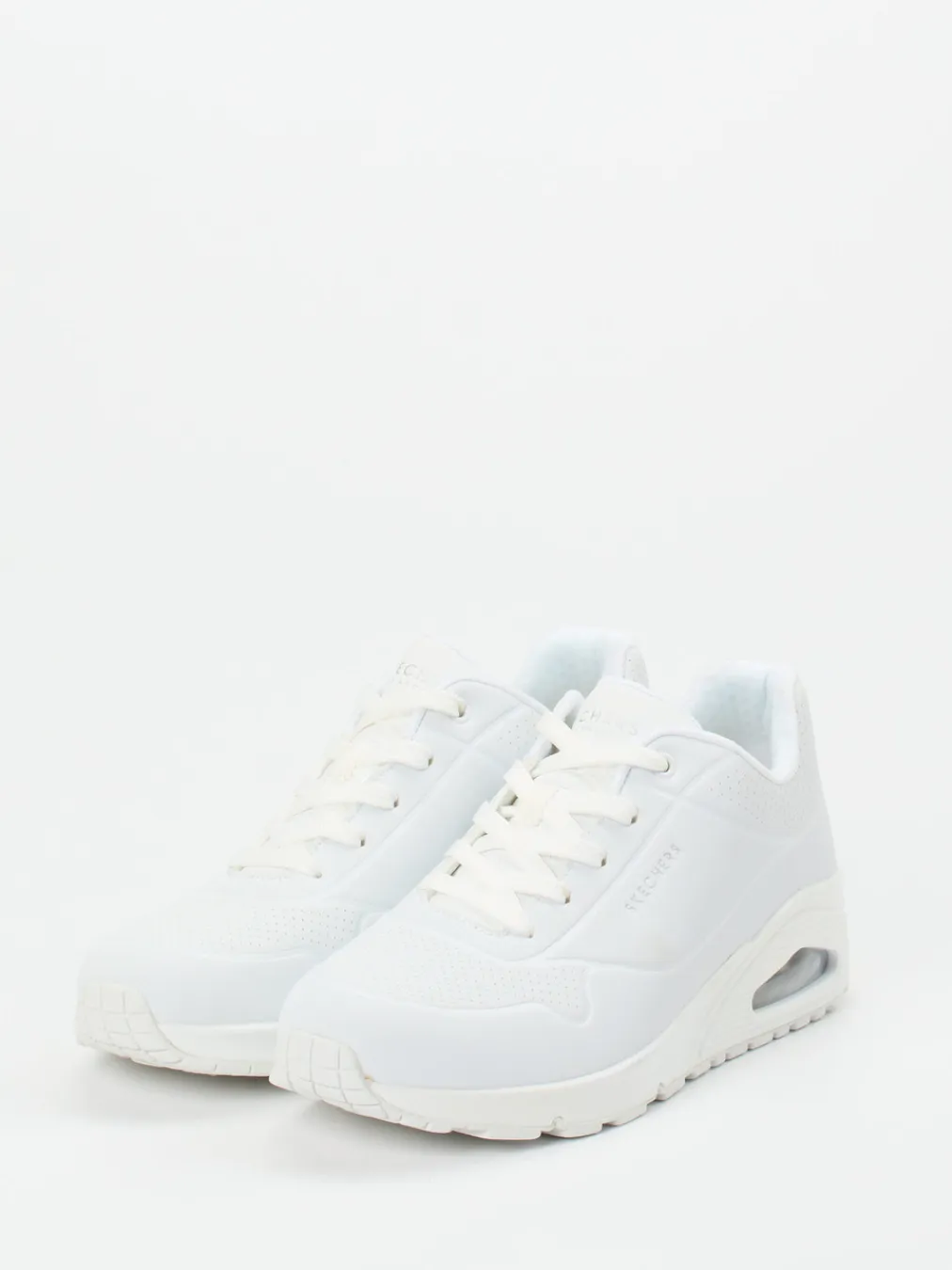 Sportiver Style im cleanen Design.Skechers präsentiert einen weißen Damen-Sneaker der Kategorie Chunky Sneaker. Ideal für bewegte Tage im urbanen Alltag: Das sportlich-voluminöse Modell setzt auf veganes Synthetikleder mit matt-perforierter Oberfläche und Mesh-Akzenten für Atmungsaktivität. Die weiße Gummisohle ist mit einem sichtbaren Air-Dämpfungselement ausgestattet, während der gepolsterte Einstieg mit Air Cooled Memory Foam-Innensohle angenehmen Tragekomfort bietet. Schnürung, Logo-Details und das Ton-in-Ton-Finish greifen klar den All-White-Trend auf. Ein stilsicherer Athleisure-Begleiter mit Streetwear-Anleihen. Komfort, Funktion und moderner Look gehen bei Skechers formschlüssig Hand in Hand.