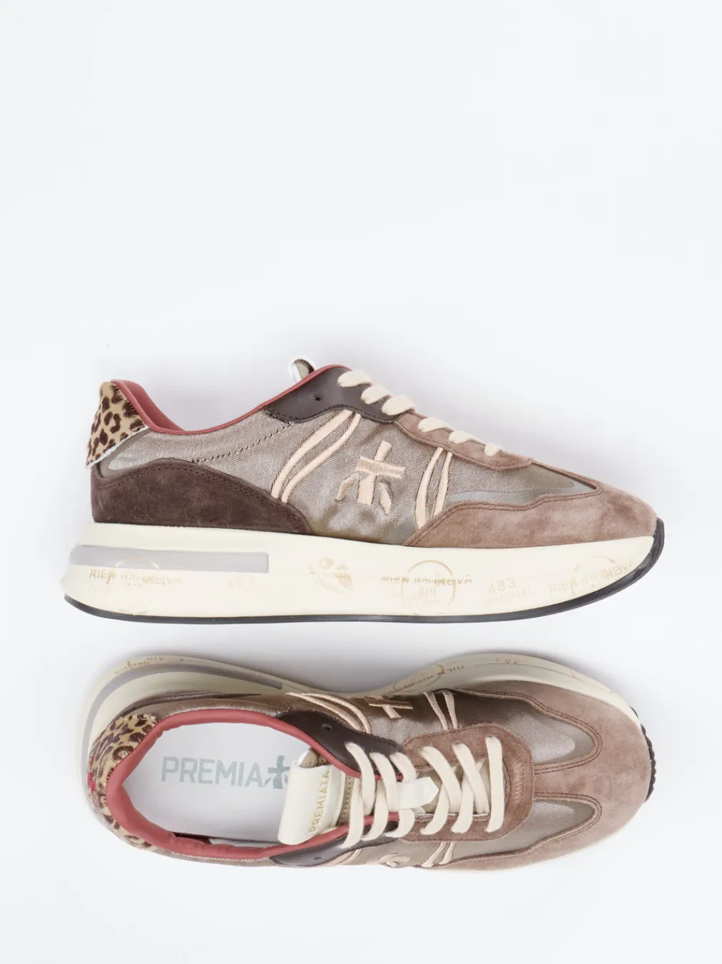 Streetstyle mit Personality.Premiata interpretiert den klassischen Damen-Sneaker neu und setzt dabei auf markante Chunky-Ästhetik. Ideal für urbane Tage mit Anspruch an Stil und Komfort: Der Sneaker vereint softes Veloursleder mit Glattleder und Mesh-Textil zu einem vielschichtigen Materialbild. Sanfte Braunnuancen in Taupe, Creme und Schokobraun prägen die Optik. Akzente setzen der Animalprint an der Ferse, seitliche Logo-Stickereien und die markant bedruckte Zwischensohle. Die profilierte Gummisohle mit Retro-Laufdesign und herausnehmbarem Fußbett verbindet Komfort mit sportivem Charakter. Perfekt zu Oversized-Hoodies oder Animal-Print-Accessoires. Ein Design, das Streetwear und Premiumanspruch überzeugend zusammendenkt.