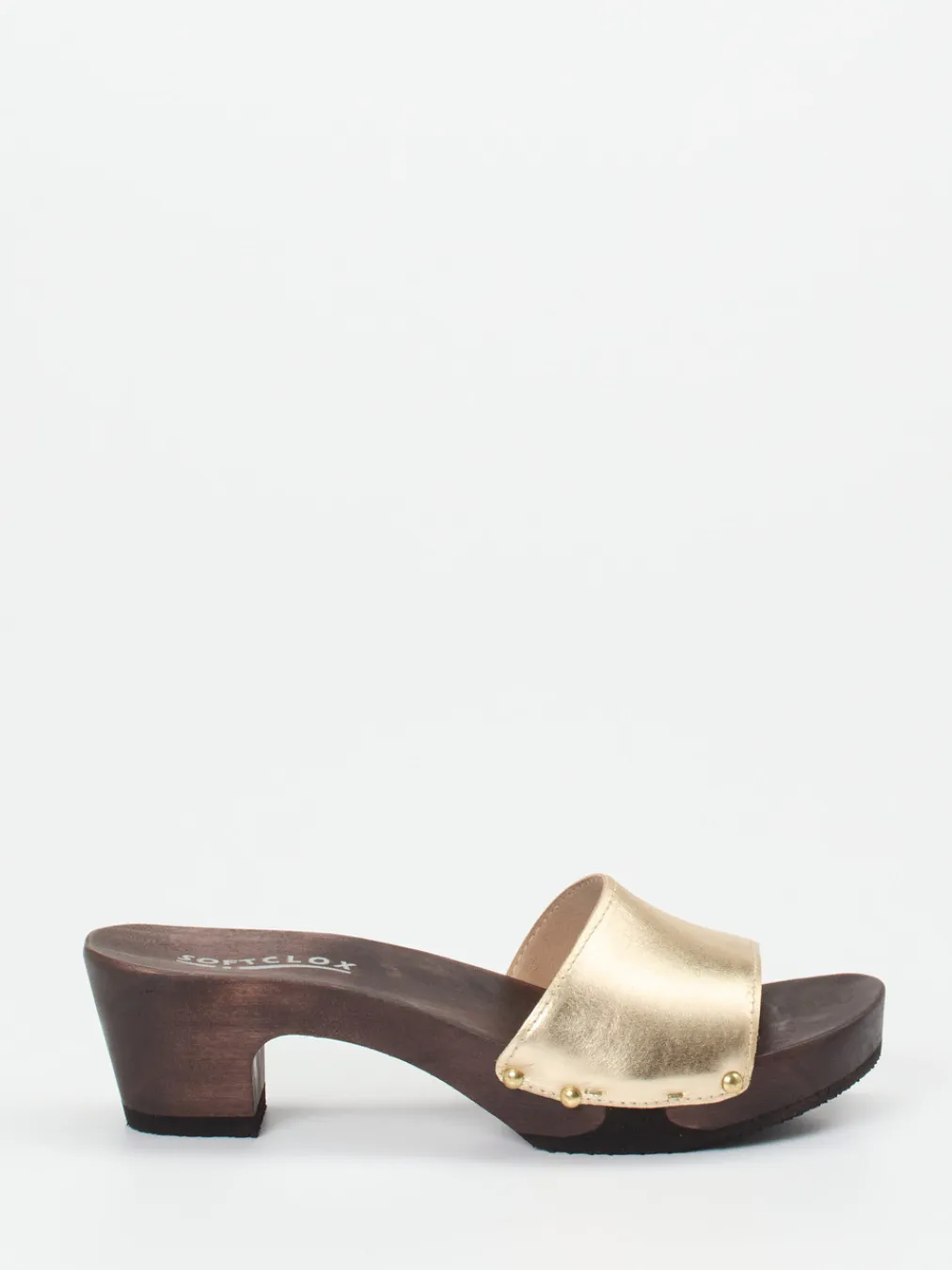 Statement in Gold und Holz.Die Damen-Clogs von Softclox verbinden modischen Anspruch mit natürlichem Materialgefühl. Ideal für warme Tage in der Stadt oder im Urlaub, kombinieren diese Pantoletten ein glänzendes Metallicleder in Gold mit einer sichtbaren Holzsohle. Der breite Spannriemen sorgt für sicheren Halt, während das integrierte Elast-Element zusammen mit dem abgestimmten Blockabsatz spürbaren Komfort bietet. Goldfarbene Nieten und ein offener trapezförmiger Schnitt verweisen stilvoll auf aktuelle Retro- und Metallic-Trends. Perfekt zu Leinenkleidern oder Culottes. Softclox setzt auf hochwertige Materialien mit alltagstauglichem Designkomfort.
