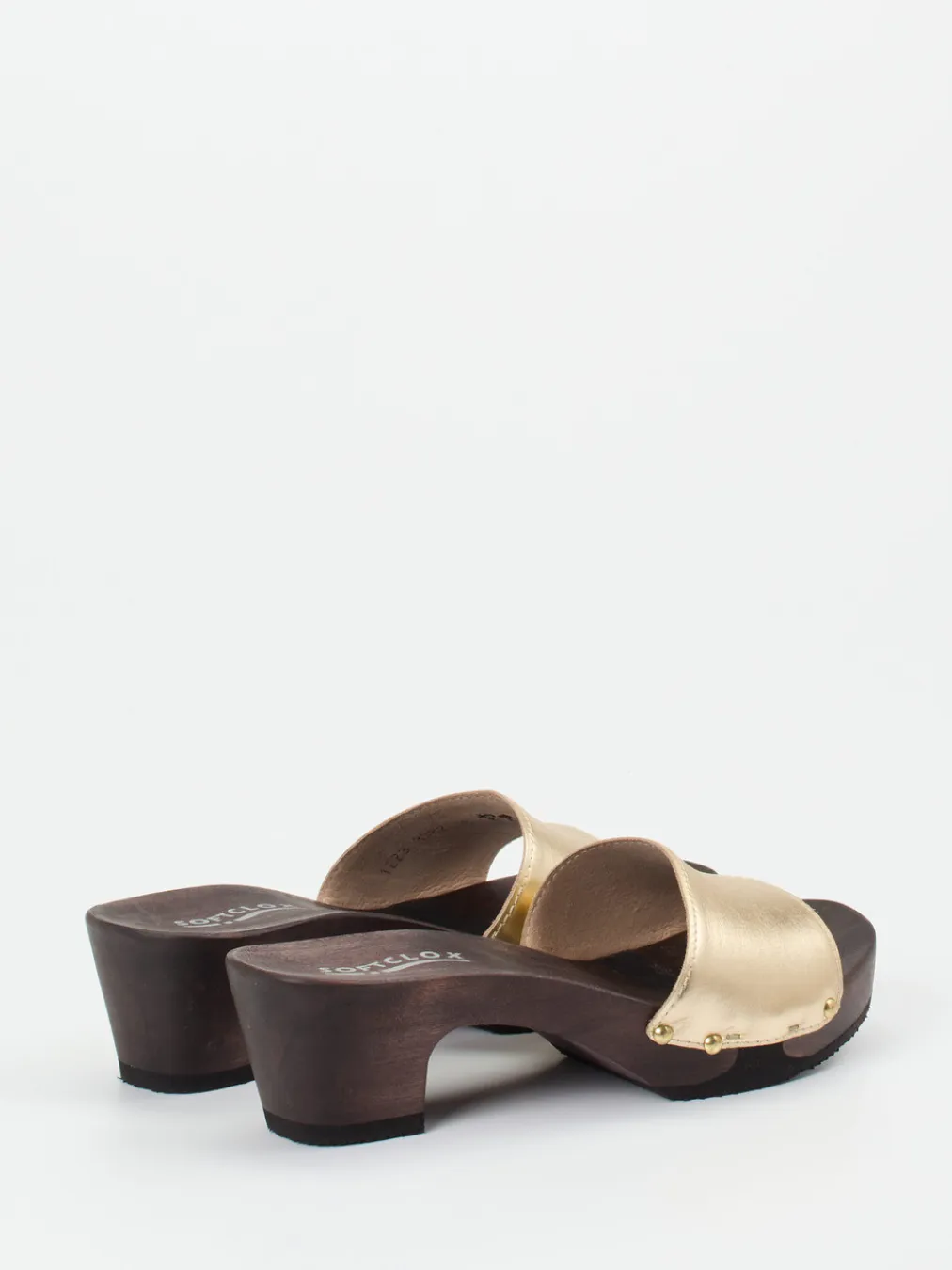 Ein gekonnter Stil-Mix aus 70s-Retro und modernem Metallic-Trend – komfortabel umgesetzt mit flexibler Holzsohle und weichem Leder.