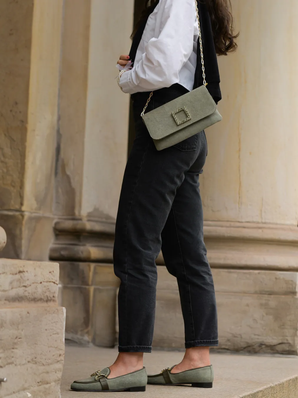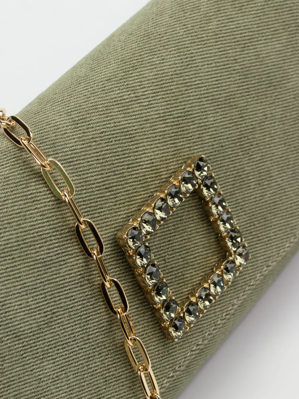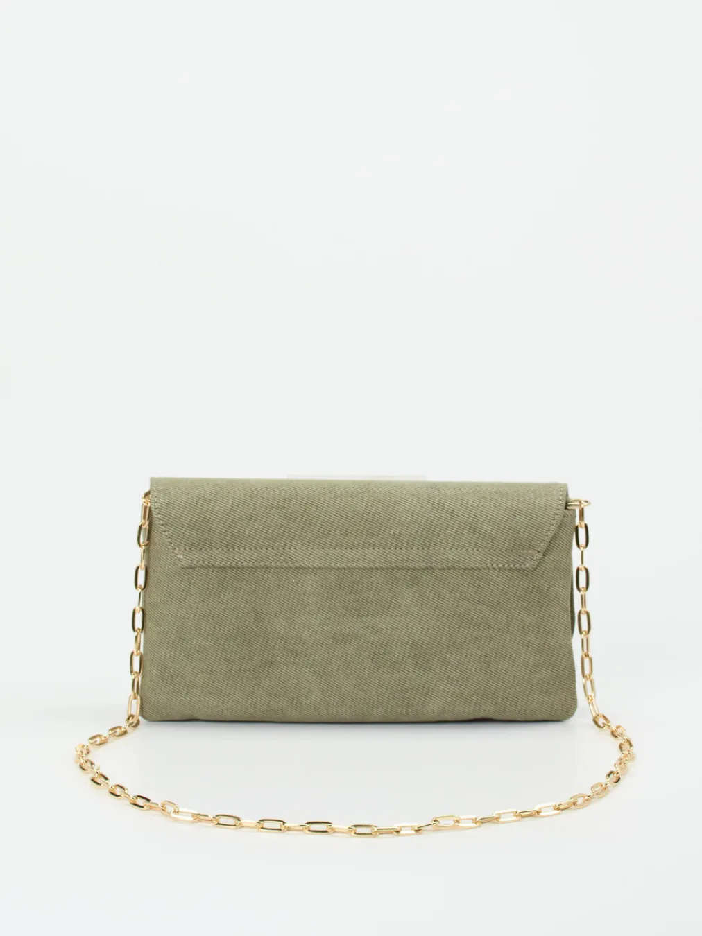 Stilvoller Minimalismus trifft auf subtilen Glamour – diese Clutch vereint zeitgemäßes Design mit einem Hauch Vintage durch goldene Kette und funkelnde Zierschließe.