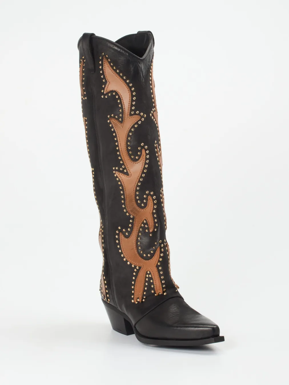 Für Events, City-Walks oder Abende mit modischem Anspruch bietet das Paar eine ideale Bühne. Gefertigt aus schwarzem Nubukleder mit samtiger Oberfläche und kontrastierenden Overlays aus cognacbraunem Kalbleder, betonen goldfarbene Nieten das Western-inspirierte Design. Die konische Spitze, Zuglaschen am hohen Schaft und der abgeschrägte Blockabsatz verleihen eine charakteristische Silhouette. Die rutschhemmende Gummisohle sorgt für Alltagskomfort. Kombiniert mit Fransen-Tasche oder Lederjacke entsteht ein trendstarker Look im Y2K-Stil.