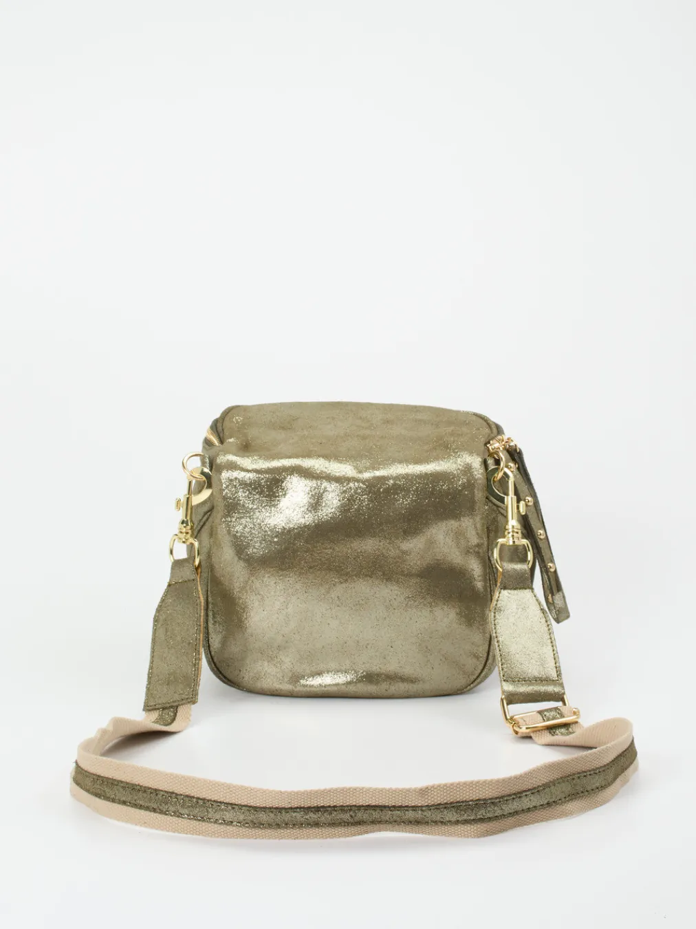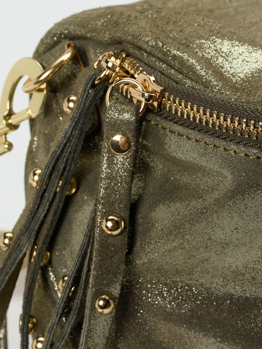 Die halbmondförmige Crossbody Bag von Marlon Firenze kombiniert glänzendes Metallicleder in Olivgold mit goldfarbener Hardware – ein stilbewusstes Accessoire für minimalistisch inspirierte Looks.