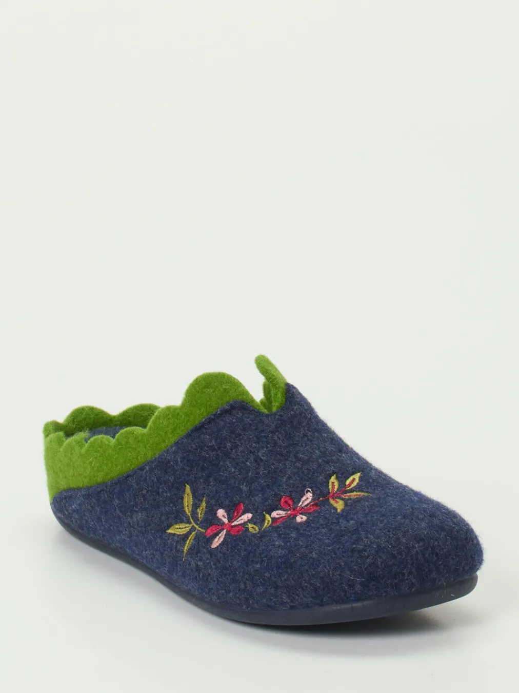 Dank des samtig-filzigen Filzmaterials sorgt das Modell für angenehme Wärme und ein behagliches Tragegefühl. Die dunkelblaue Farbgebung wird durch eine detailreiche Stickerei in Himbeerrosa und Moosgrün akzentuiert. Der offene Fersenbereich erleichtert das Hineinschlüpfen, während die biegsame, rutschhemmende Gummisohle sicheren Halt bietet. Die Innensohle ist weich gepolstert und unterstützt den Fuß bei jedem Schritt. Perfekt für stilbewusste Loungewear-Looks und wohlige Wintertage.