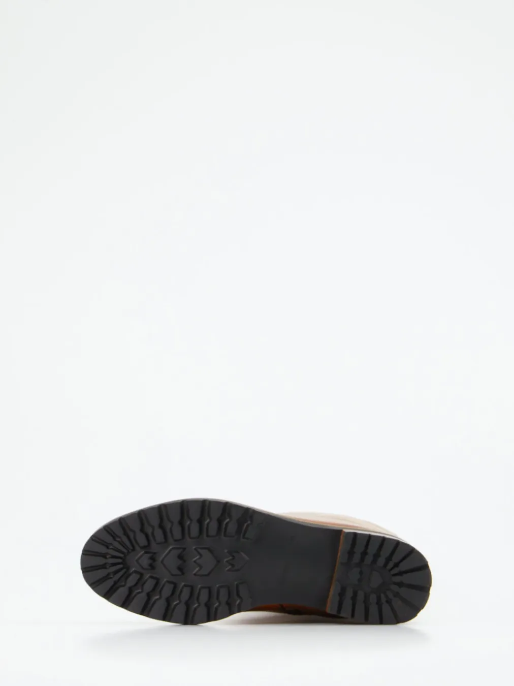 Die Marke Ginger & Glove präsentiert einen kniehohen Damenstiefel in cognacfarbenem Kalbleder mit dezenter Glanzoptik.