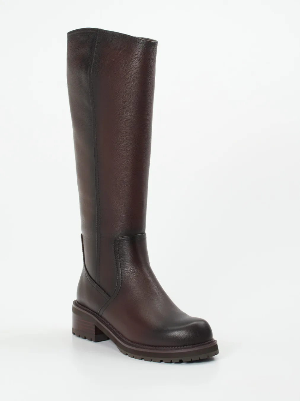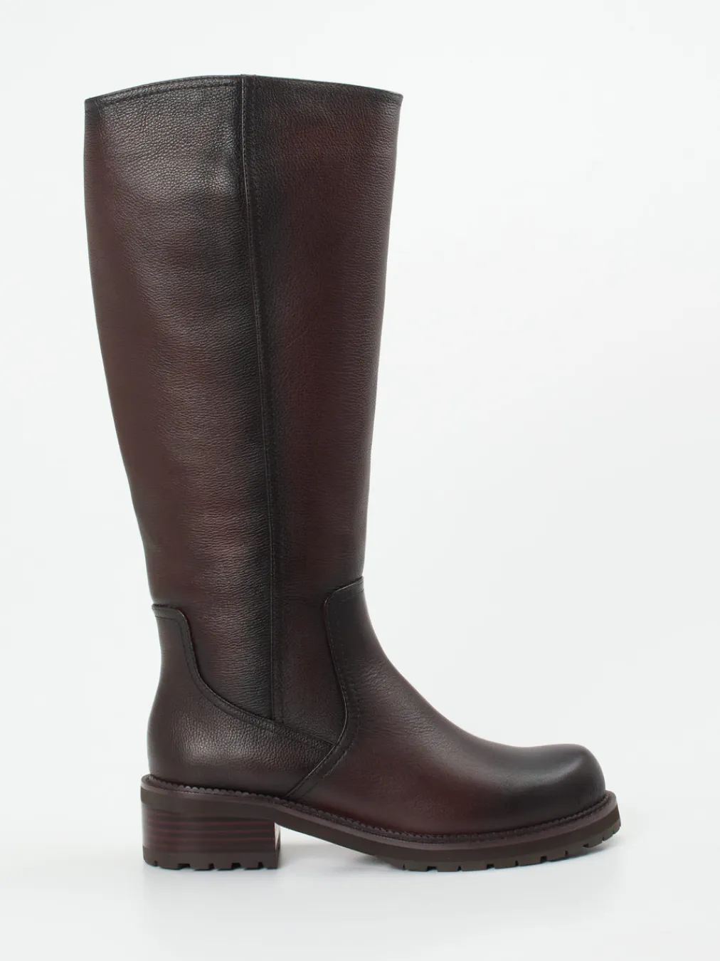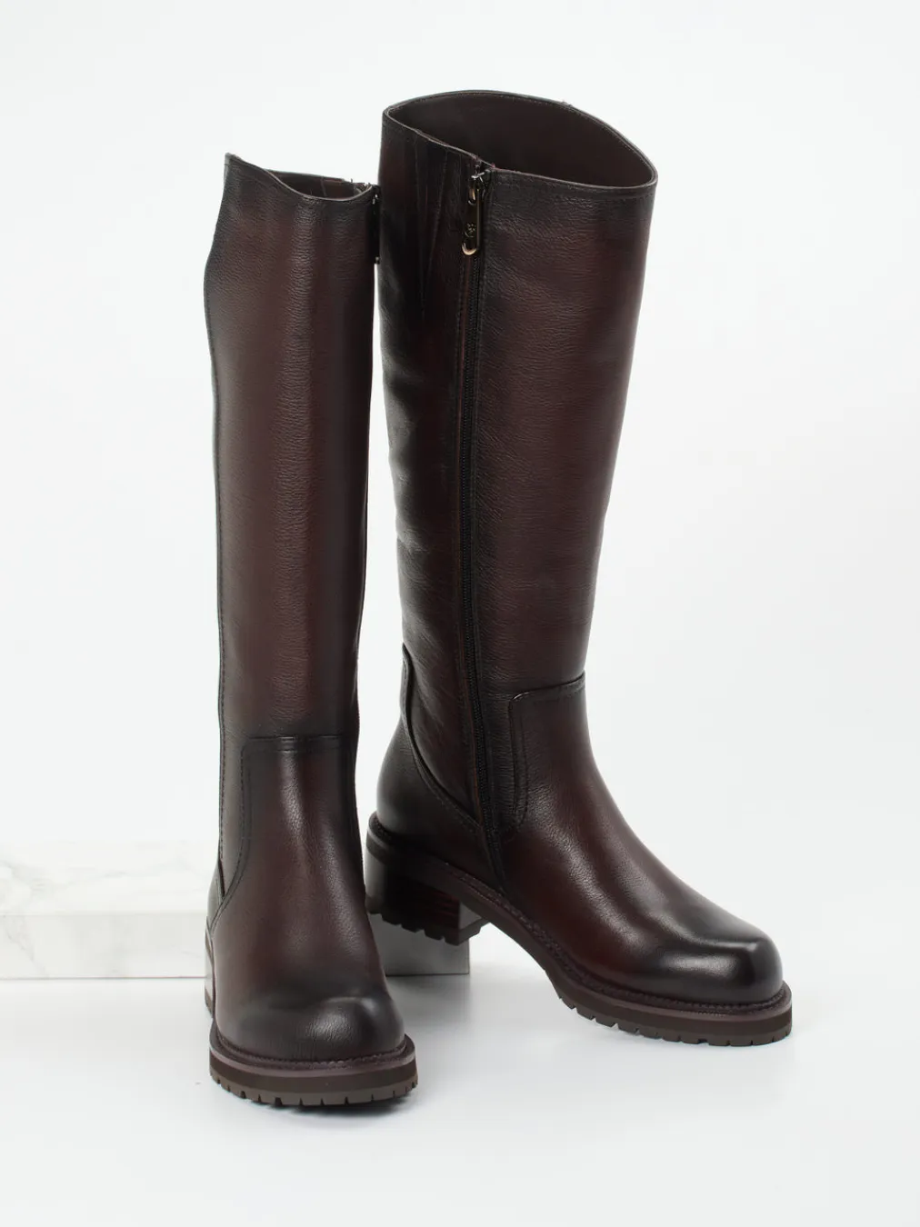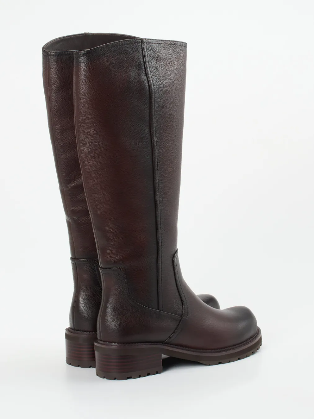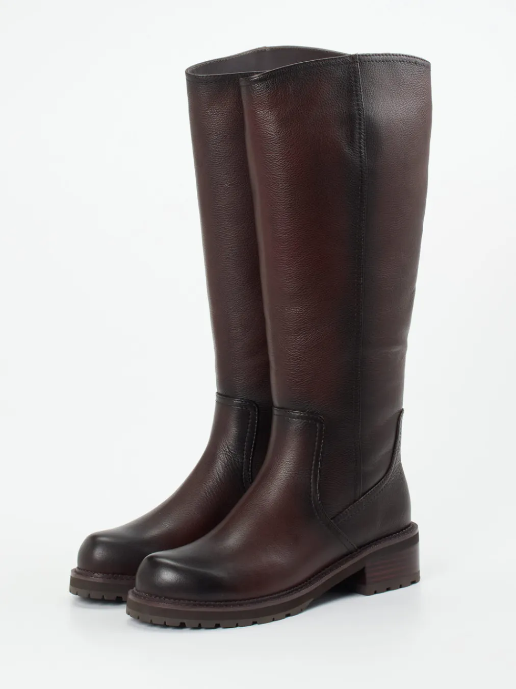 Gefertigt aus genarbtem, mahagonifarbenem Kalbleder verbinden diese kniehohen Stiefel zeitlose Eleganz mit funktionaler Robustheit – ideal für kühle Tage und stilvolle Alltagslooks.