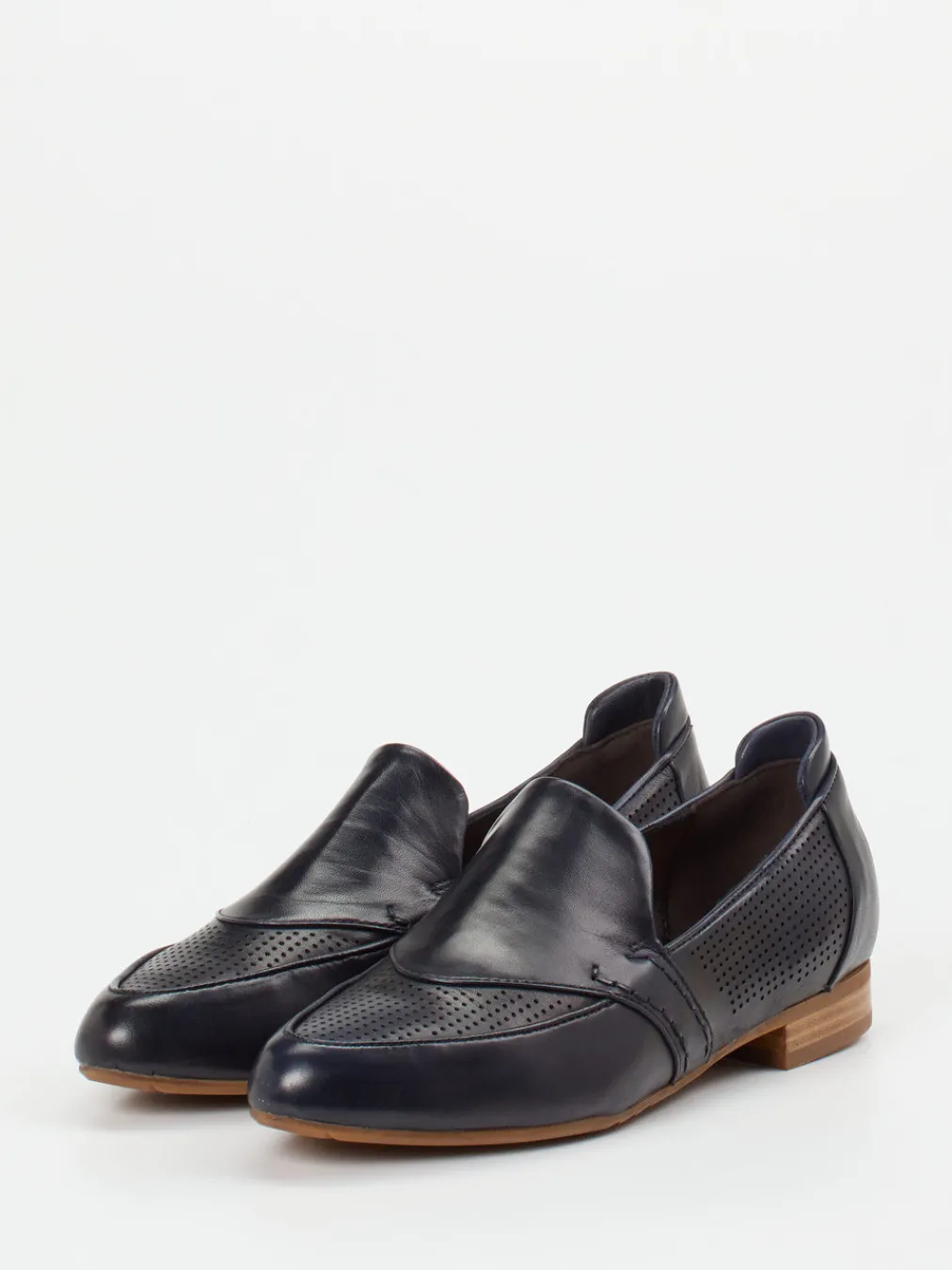 Leichtigkeit im Büroalltag.Die Marke Ginger & Glove präsentiert mit diesem Loafer einen stilvollen Slipper für Damen. Ideal für stilbewusste Tage im Büro oder in der City, überzeugt das Modell durch feines, dunkelblaues Lammleder mit glänzendem Finish. Feine Perforationen am Vorderblatt und den Seiten sorgen nicht nur für Atmungsaktivität, sondern setzen auch dezente Akzente im minimalistischen Design. Die klassische, flache Silhouette in Schlupfform wird durch eine profilierte Gummisohle mit einem flachen Absatz in Holzoptik ergänzt. Assoziationen zu „Quiet Luxury“ machen diesen Schuh trendstark wie zeitlos. Raffinierte Eleganz trifft bei Ginger & Glove auf hohen Tragekomfort.