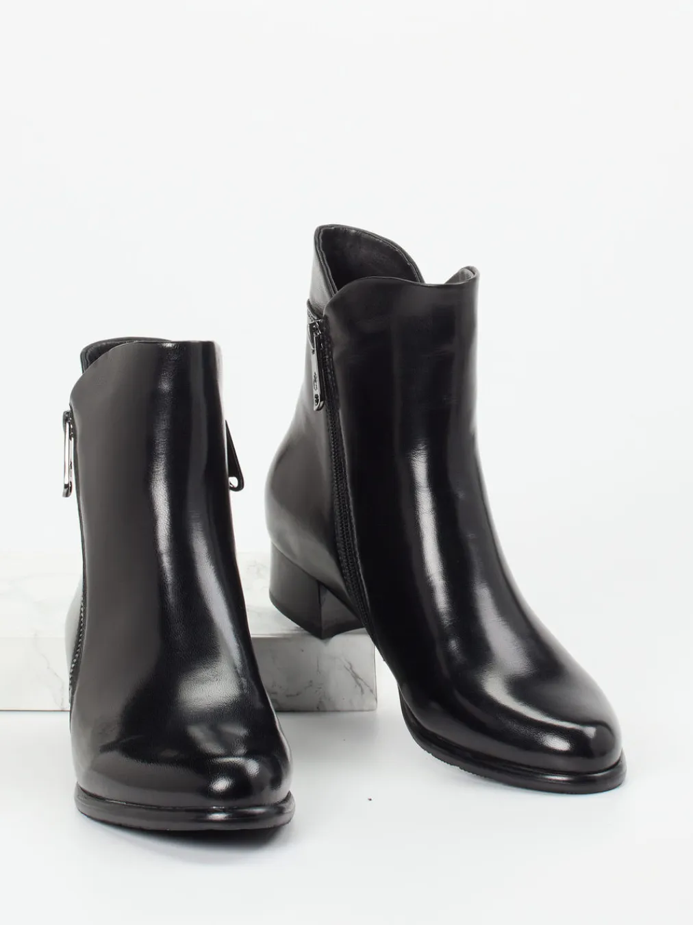 Diese klassisch-knöchelhohe Stiefelette aus glänzendem Lammleder verbindet minimalistisches Design mit alltagstauglichem Komfort. Ein dezenter Reißverschluss akzentuiert den cleanen Look.