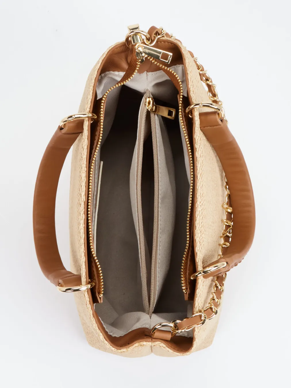 Eine stilvolle Begleiterin für warme Tage: Diese Handtasche vereint sommerliche Raffia-Optik mit cognacfarbenem Kunstleder – ein harmonisches Zusammenspiel aus Trend und Funktion.