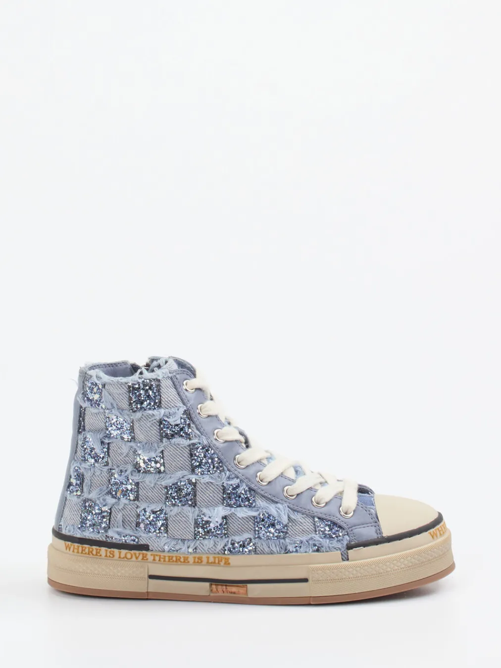Streetstyle mit Glitzerfaktor.Rebecca White präsentiert in der Kategorie High-Top Sneaker ein markantes Modell für trendorientierte Looks. Ob als Blickfang im urbanen Alltag oder als Statement bei Abend-Events: Der Sneaker kombiniert jeansblaues Textil mit schachbrettartigen Glitzerelementen in einer fransigen, leicht rockigen Textur. Die Silhouette greift klassische Basketball-Formen auf und wird durch Schnürung sowie seitlichen Reißverschluss ergänzt. Eine profilierte Gummisohle mit eingraviertem Statement-Text unterstreicht den individuellen Charakter. Influencet von der Y2K-Ästhetik und Streetwear-Trends wirkt der Schuh besonders jung und expressiv. Ideal zu Oversized-Denim und Graphic-Shirts. Ein charakterstarker Begleiter mit urbaner Attitüde – typisch Rebecca White.