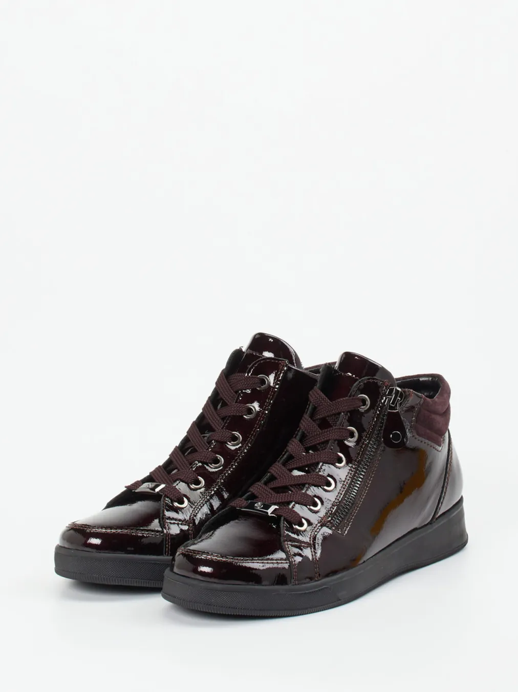 Glänzendes Lackleder in Dunkelbordeaux und funktionale Details vereinen sich in diesem High-Top-Sneaker von Ara zu stilvoller Alltagstauglichkeit mit Komfort.