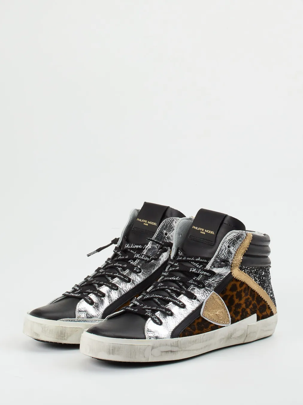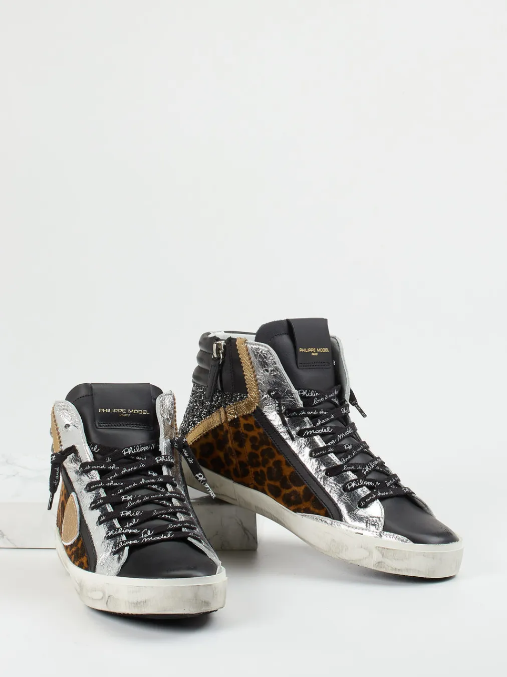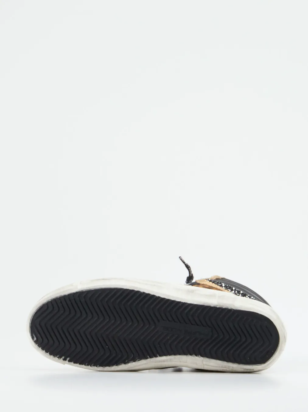 Ob für Konzertbesuch oder Ausgeh-Abend – dieser Schuh fällt auf: Geprägtes Leder kombiniert mit glatter, metallic-glänzender Oberfläche und glitzernden Partien an der Ferse sorgen für einen ausdrucksstarken Look. Schwarz dominiert, ergänzt von goldenen und silbernen Akzenten sowie einem Leopardenprint. Die klassische High-Top-Form, gepolsterter Schaftrand und seitliches Logo-Patch betonen den Stilcharakter. Schnürung mit Schriftzügen, Gummisohle im Used Look und angenehmes Frottee-Innenfutter machen ihn komfortabel und trendorientiert zugleich. Perfekt zu Skinny Jeans oder Bomberjacke.