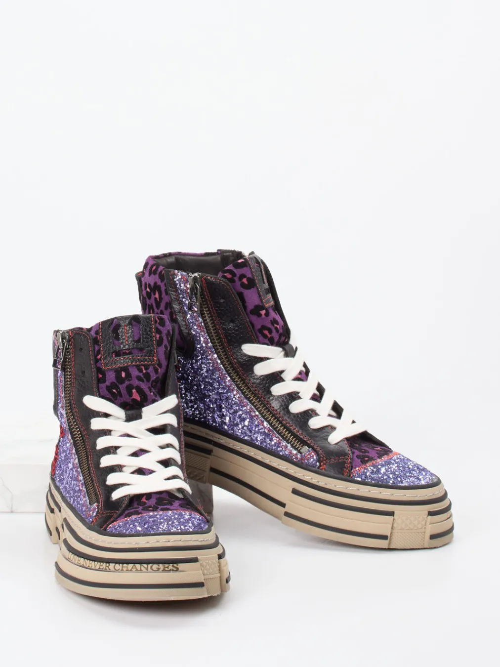 Chunky Sneaker mit Glitzer-Faktor.Rebecca White präsentiert einen ausgefallenen Damen-Sneaker aus der Kategorie High-Top, inspiriert vom Y2K-Stil und urbaner Streetwear. Für alle, die im Alltag oder bei Events starke Akzente setzen wollen: Das Metallic-Obermaterial mit violetter Glitzertextur trifft auf Velours- und Glattleder in Schwarz und ein auffälliges Leomuster. Die chunky Plateausohle mit eingeprägtem Schriftzug „LOVE NEVER CHANGES“ verleiht dem Look Tiefe und Haltung. Kombiniert mit Reißverschlussdetails, Kontrastnähten und hohem Schaft entsteht ein Style-Statement zwischen Retro und Moderne. Ideal zu Oversized-Hoodies oder Metallic-Accessoires. Markentypisch ausdrucksstark mit klarer Trend-DNA und bequemer Lederfütterung.
