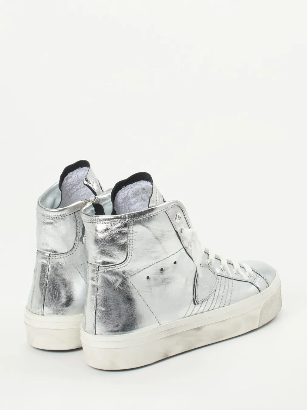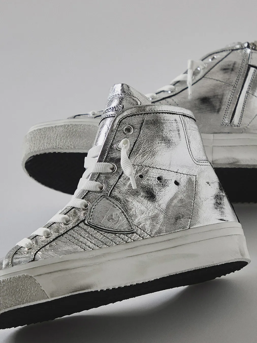 Der Philippe Model High-Top überzeugt durch silberfarbenes Metallicleder im Used-Look und eine moderne Kombination aus Schnürung und Reißverschluss.