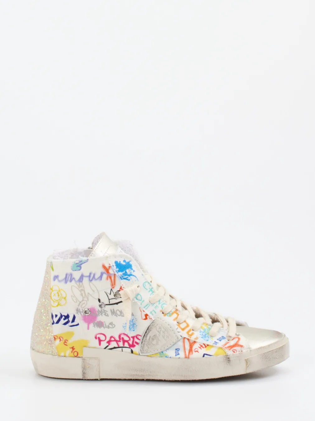 Streetwear trifft Pariser Nonchalance.Philippe Model erweitert mit diesem High-Top Sneaker die Damenkollektion um ein expressives Designstück. Ein idealer Begleiter bei Freizeitaktivitäten oder abendlichem Ausgehen: Der mehrfarbige Sneaker aus Textil zeigt sich mit glitzernden Partien, silberner Metallic-Lederkappe und einem markanten Graffiti-Print. Der hohe Schnitt wirkt klassisch, während Details wie das seitliche Markenwappen und die Vintage-Gummisohle die urbane Ausstrahlung unterstreichen. Ein innenliegender Reißverschluss erleichtert das An- und Ausziehen. Inspiriert von Streetstyle und Y2K-Trends, passt er hervorragend zu Oversized-Hoodies oder Destroyed Jeans. Ein Design voller Energie – exzentrisch, selbstbewusst und unverkennbar Philippe Model.