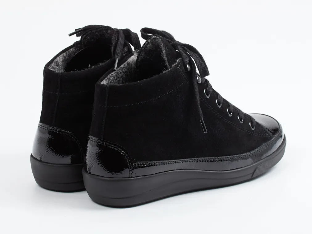 Mit weichem Wollfutter und einem Mix aus samtigem Velours- und glänzendem Lackleder zeigt dieser Sneaker funktionale Eleganz mit einem Touch Urbanität.