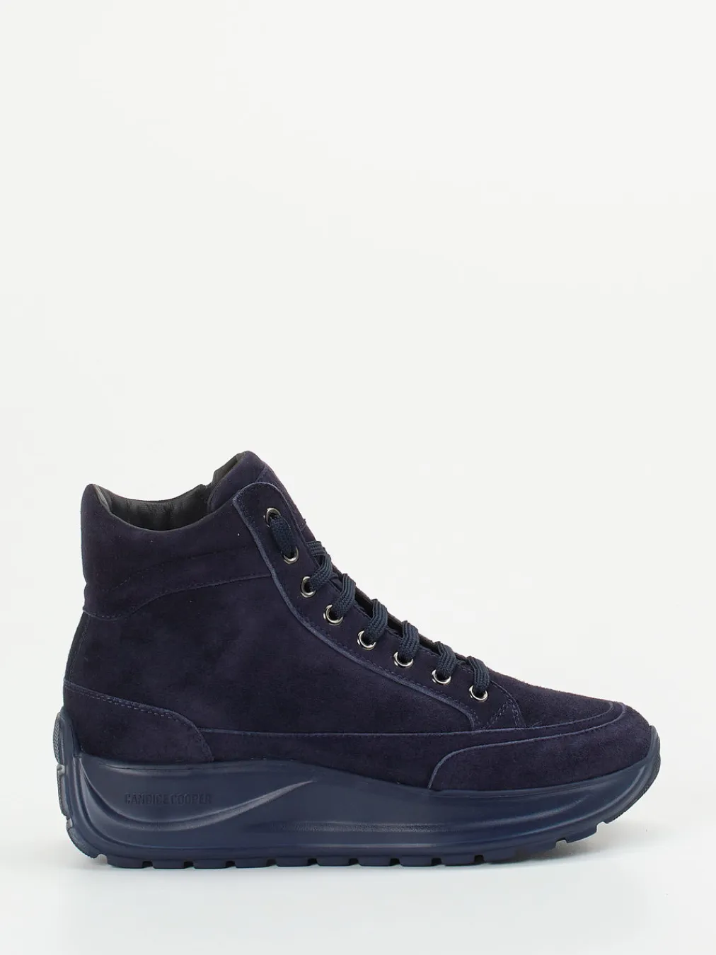 Urbaner Stil trifft Komfort.Candice Cooper präsentiert einen modernen High-Top-Sneaker für Damen aus samtig angeschliffenem Veloursleder. Die dunkelblaue Farbgebung in Kombination mit dem tonalen Design und der klaren Silhouette macht diesen Sneaker zum idealen Begleiter für minimalistische Freizeit-Styles. Der Mix aus Schnürung und seitlichem Reißverschluss erleichtert das Anziehen, während die komfortable, leicht strukturierte Plateausohle für Stabilität und modische Präsenz sorgt. Dezente Metallösen und ein toniges Branding unterstreichen die clean-sportive Optik. Der knöchelhohe Schnitt orientiert sich am aktuellen Platform-Trend der Saison. Ein stilvoller City-Sneaker mit Candice-Cooper-Komfortanspruch.