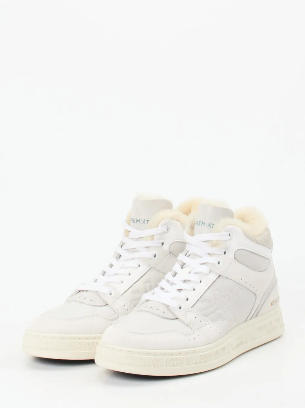 Retro-Komfort für winterliche Tage.Premiata zeigt einen High-Top-Sneaker, der Streetstyle und Komfort elegant vereint. Für entspannte Wintertage mit Stil: Der Sneaker aus hochwertigem Veloursleder, ergänzt durch Details aus glattem Leder, präsentiert sich in einem harmonischen Mix aus Offwhite und Beige. Die matte Oberfläche, tonale Nähte sowie ein goldfarbener Schriftzug an der Ferse unterstreichen das ruhige Design. Innen sorgt das Futter aus Lammfell in kontrastfreier Optik für spürbare Wärme. Die klassische Silhouette mit Schnürung und gummierter Fischgrätsohle verleiht dem Modell eine retro-inspirierte Note. Perfekt kombinierbar mit naturfarbenen Hoodies oder hellen Jogpants. Ein markentypischer Winter-Sneaker mit komfortorientierter Streetwear-Attitüde.