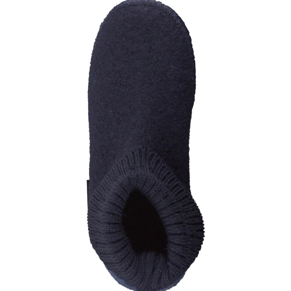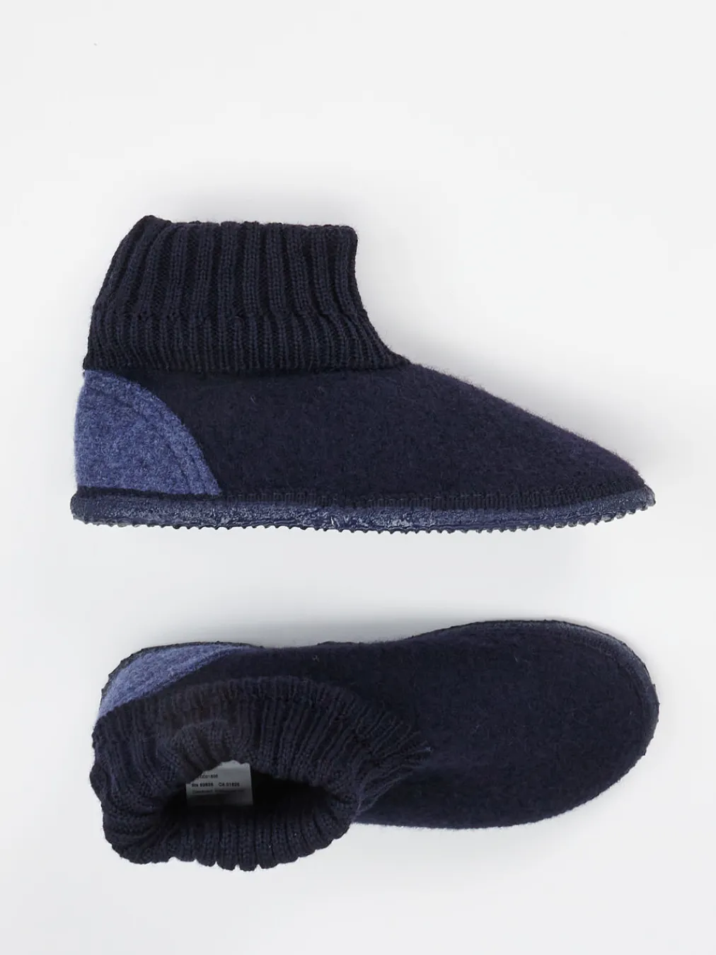 Dank wärmendem Wollwalk bietet der Schuh ein ausgeglichenes Fußklima, während die samtig-filzige Oberfläche einen gemütlichen Eindruck hinterlässt. Der dunkelblaue Grundton mit hellblauer Fersenzone wirkt dezent lebendig. Der gestrickte Schaftabschluss und der sockenähnliche Einstieg ermöglichen unkompliziertes Anziehen und besten Halt. Die rutschfeste, naturkautschukbasierte Gummisohle unterstreicht den funktionalen Charakter. Die minimalistische Form passt perfekt zu entspannter Loungewear.
