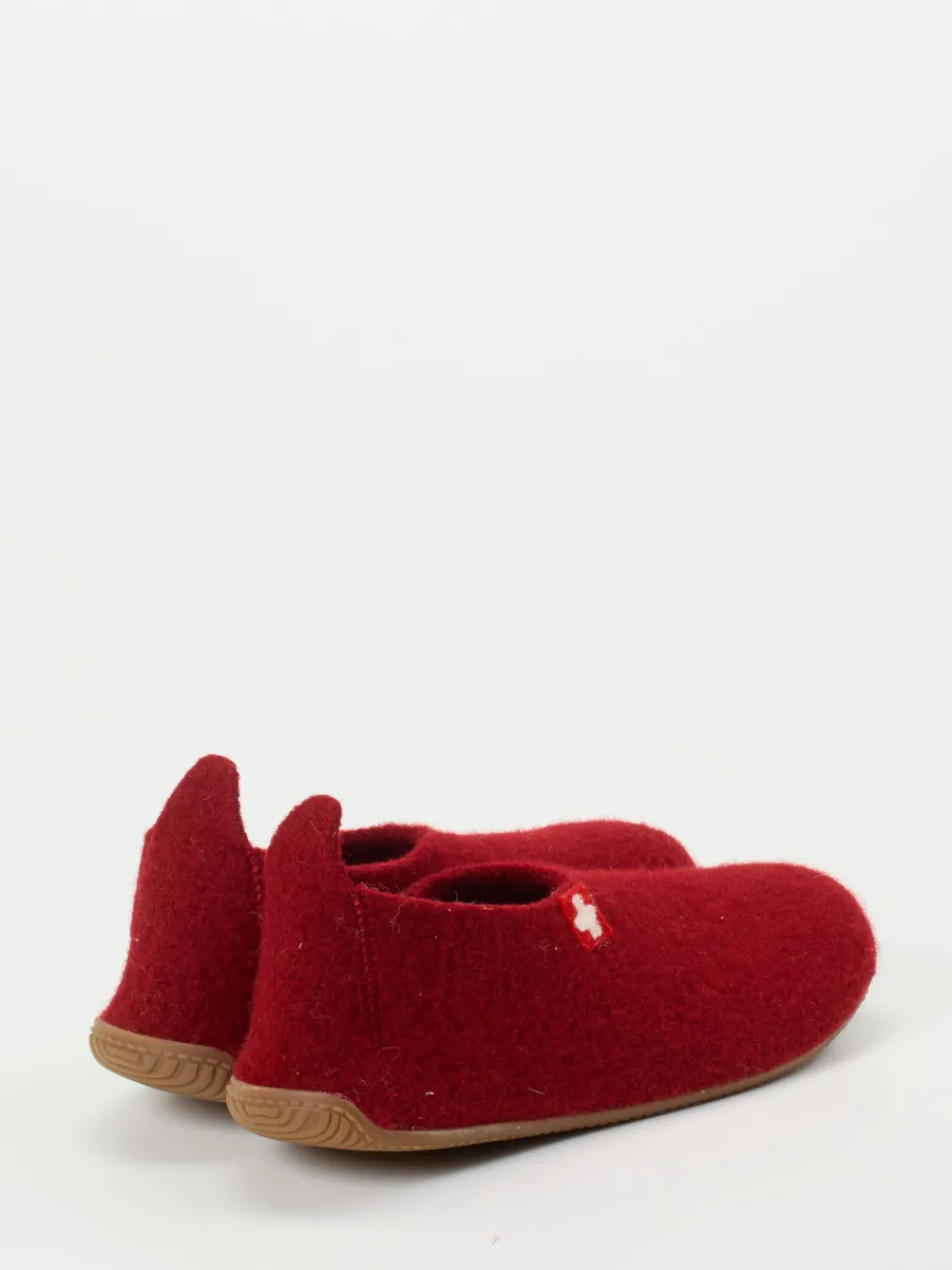 Der dunkelrote Hüttenschuh aus Wollfilz kombiniert alpeninspirierte Ästhetik mit funktionalem Komfort – ideal für stilvolle Ruhephasen zu Hause.