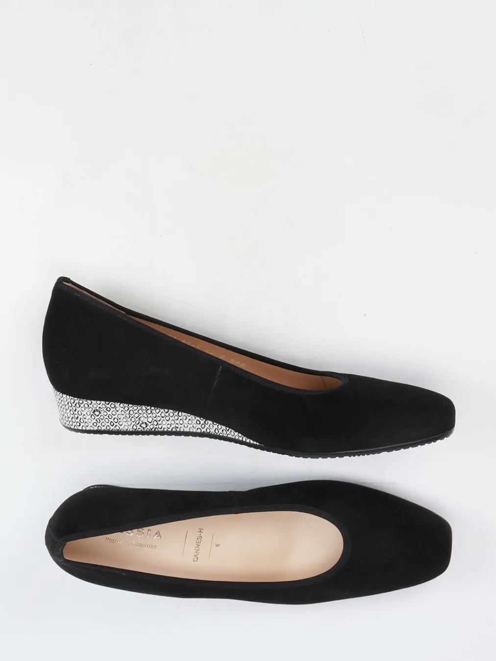 Eleganter Komfort mit modischem Detail.Die Damenpumps von Hassia gehören zur Linie Cannes und vereinen Komfort mit klarer Ästhetik. Ideal für Büro oder Freizeit, vereint dieses Modell schwarzes, samtig angeschliffenes Veloursleder mit einem bequemem Keilabsatz in subtiler Schlangenmuster-Optik. Der elastische Einfass sorgt für angenehmen Sitz, während das gepolsterte, wechselbare Fußbett auch Raum für eigene Einlagen bietet. Dank schlupffreundlicher Form lässt sich der Schuh unkompliziert an- und ausziehen. Die dezente Karé-Spitze und das matte Finish fügen sich stilsicher in minimalistische wie klassische Garderoben ein. Markentypisch in Komfortweite H und mit griffiger Gummisohle – ideal für langes Tragen mit stilvollem Auftritt.