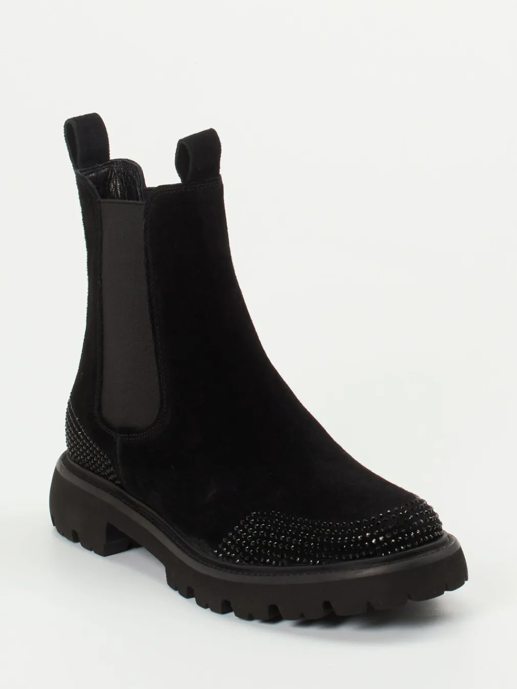 Die Kombination aus samtigem Veloursleder, tonalen Strassdetails und strukturierter Sohle verleiht diesen Chelsea Boots eine edle Alltagstauglichkeit mit Glamour-Akzent.