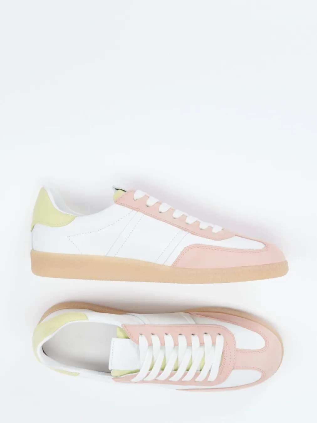 Ob beim Stadtbummel oder auf dem Weg ins Café: Die Kombination aus weißem Kalbleder und soft angeschliffenem Nubukleder in Rosé und Pastellgelb wirkt stilvoll und trendbewusst zugleich. Die klassische, flache Silhouette, dezente Ton-in-Ton-Nähte und farbige Overlays betonen den Retro-Charakter. Eine gepolsterte Ferse sorgt für angenehmen Komfort, die profilierte Gummisohle bietet sicheren Halt. Der Look ist ideal für das Y2K-Revival und passt zu neutralen Tönen sowie weiten Hosen und Crossbody-Bags in Pastell.