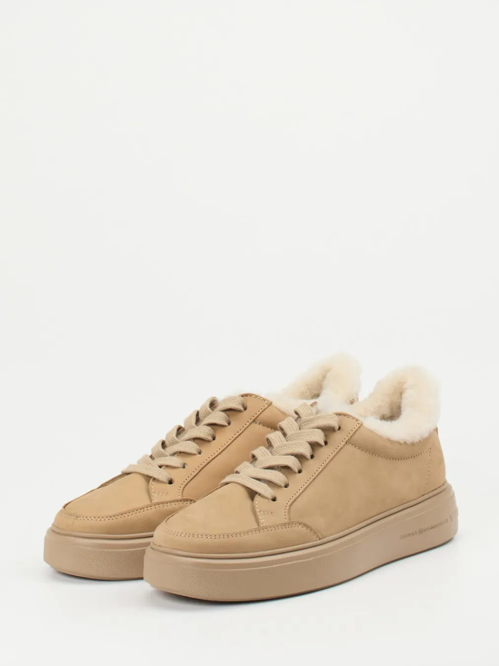 Ob beim Stadtspaziergang oder im entspannten Freizeitlook – dieses Modell verbindet Komfort und Stil. Die matte Oberfläche, das kuschelig natürliche Lammfellfutter und die tonige Plateausohle mit eingeprägtem Branding verleihen dem Low-Top-Sneaker eine ruhige, hochwertige Ausstrahlung. Seine klassische Form mit runder Silhouette und feinen Steppnähten macht ihn zu einem vielseitigen Begleiter für Cozy-Core-Looks. Ideal zu grob gestrickten Pullovern oder beigen Wollmänteln.