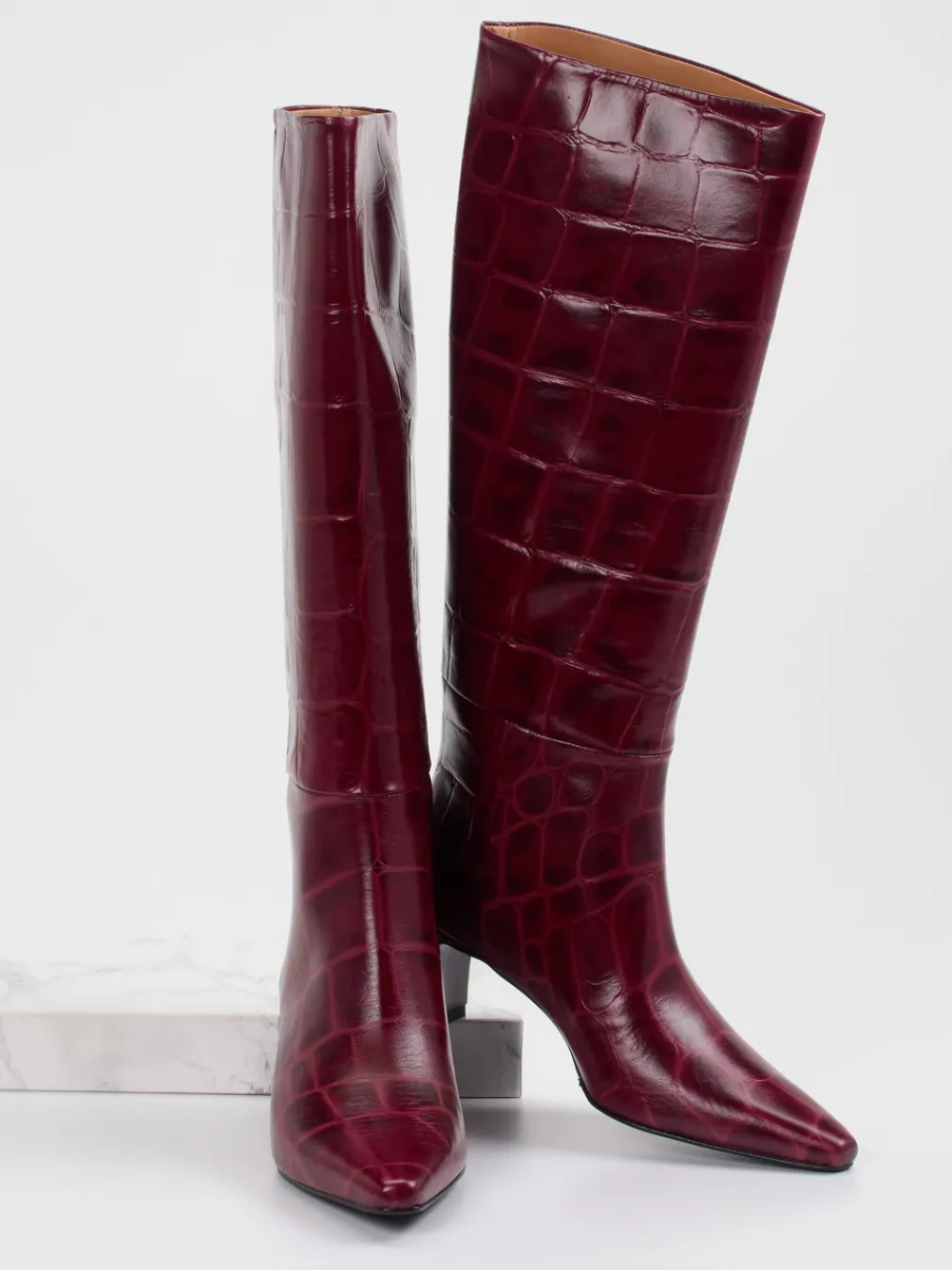 Stilvoll durch Herbst und Winter.Konstantin Starke interpretiert mit diesen kniehohen Damenstiefeln klassische Eleganz für die moderne Saison. Ideal für den stilvollen Alltag oder das Business-Outfit: Der tief bordeauxrote Stiefel besteht aus geprägtem Leder mit hochglänzender Krokoprägung – ein Statement in Struktur und Farbe. Die spitz zulaufende Front, der 5 cm hohe Blockabsatz und die gerade Schaftform betonen eine feminine Vintage-Linie mit minimalistischer Ton-in-Ton-Optik. Die glatte Gummisohle sorgt für Tragekomfort im urbanen Umfeld. Perfekt kombinierbar mit Mantel oder Hosenanzug. Ein ausdrucksstarkes Design mit luxuriösem Feingefühl – Konstantin Starke überzeugt mit moderner Klassik.