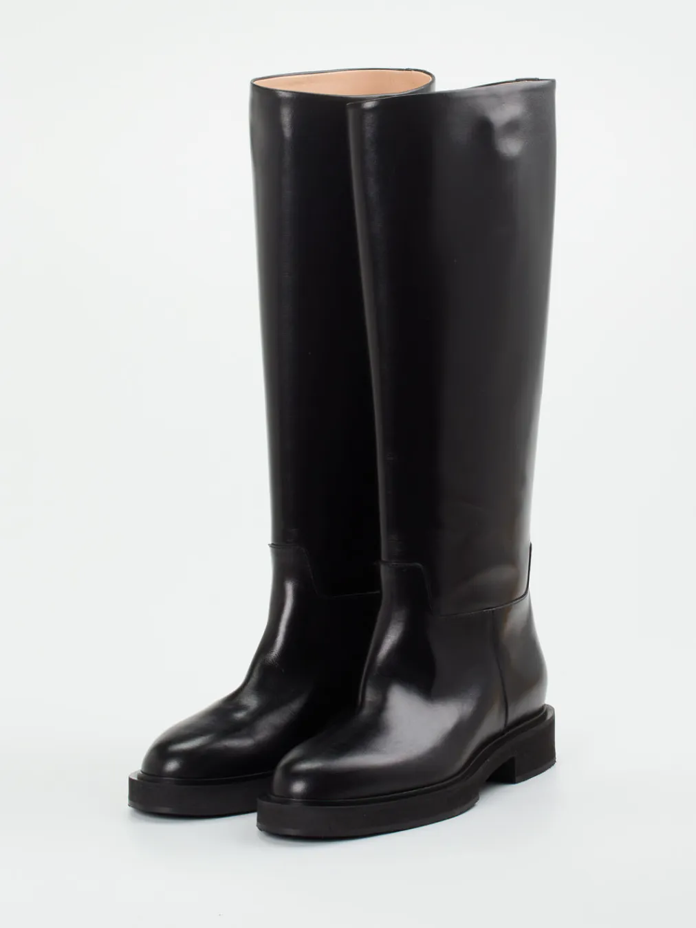 Dieser kniehohe Stiefel von Unützer vereint italienische Handwerkskunst mit moderner Reitstiefel-Ästhetik. Die glänzende Oberfläche verleiht dem Design einen stilvollen, minimalistischen Touch.