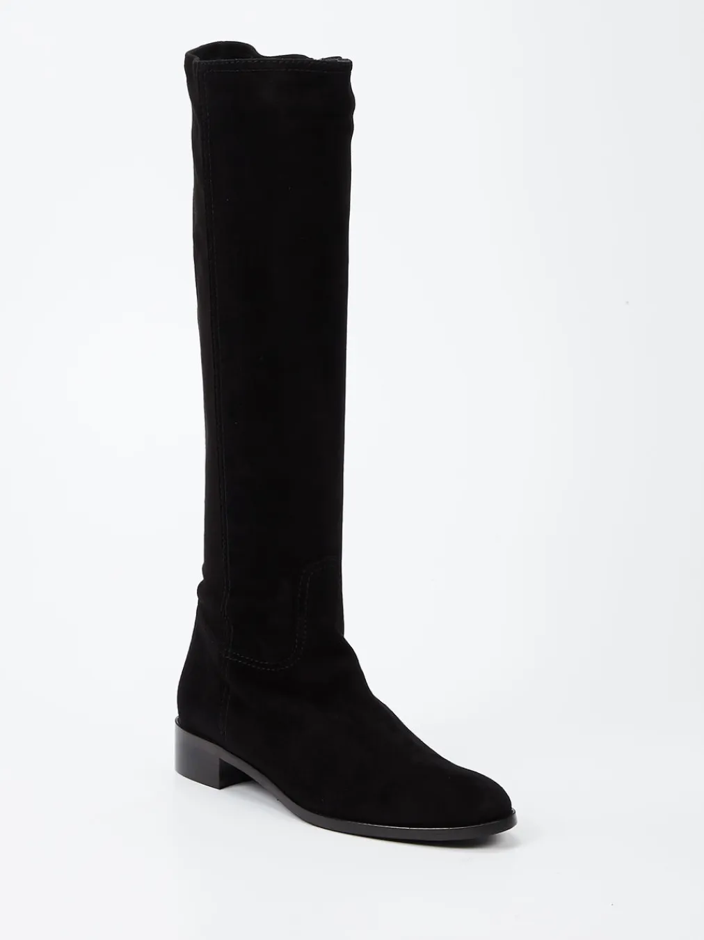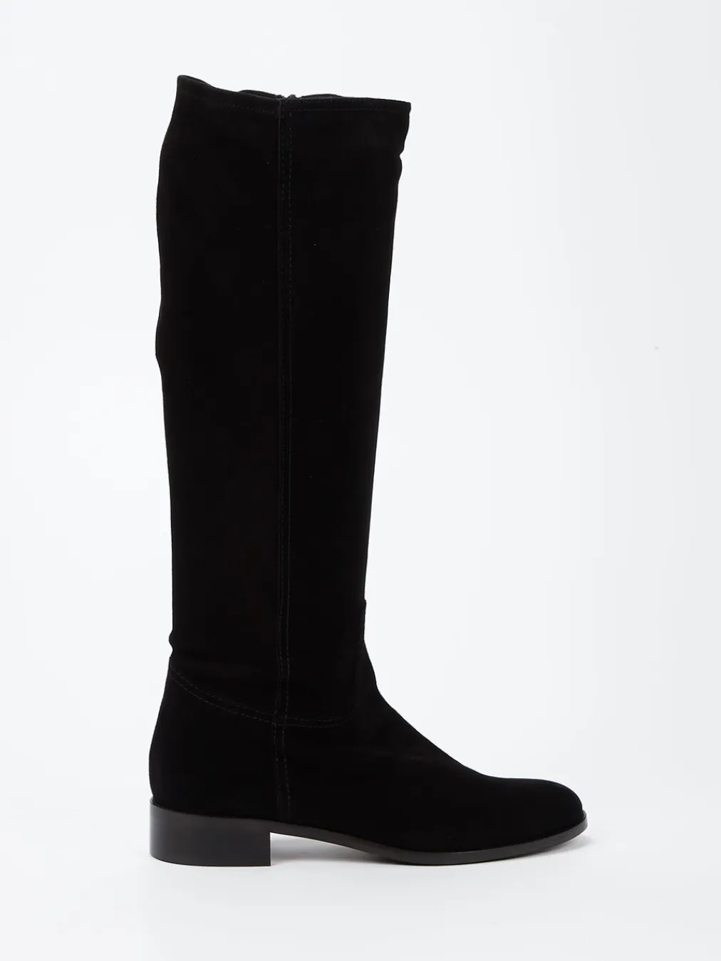 Eleganz in klarer Form.Die Marke Konstantin Starke liefert mit diesem kniehohen Damenstiefel einen Stilklassiker neu interpretiert. Für klar strukturierte Herbsttage wie für formelle Bürolooks bietet dieser Stiefel aus schwarzem Lammleder mit samtiger Veloursstruktur stilvolle Bodenhaftung. Die matte Oberfläche, die dezente Ton-in-Ton-Verarbeitung und der schlanke Innnenreißverschluss ergeben eine reduzierte, feminine Silhouette mit flachem Blockabsatz für angenehmen Komfort. Klare Linien und hochwertige Verarbeitung fügen sich in die Trends von Quiet Luxury und Minimalismus – ideal kombinierbar mit Kaschmirmantel oder schwarzer Lederhandtasche. Ein Schuh für moderne Alltagssituationen mit souveräner Zurückhaltung – made by Konstantin Starke.
