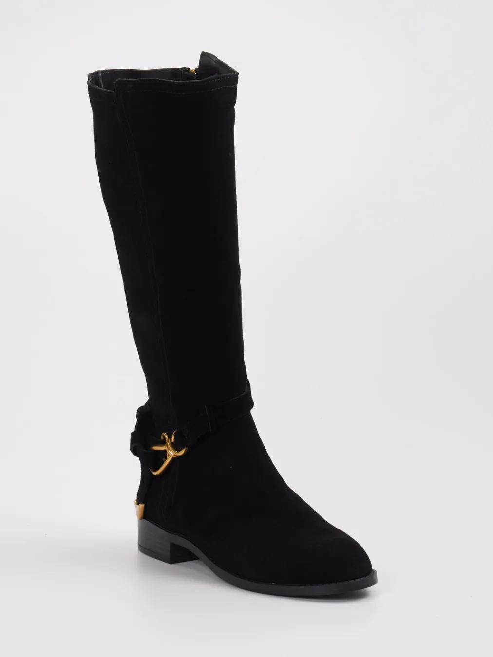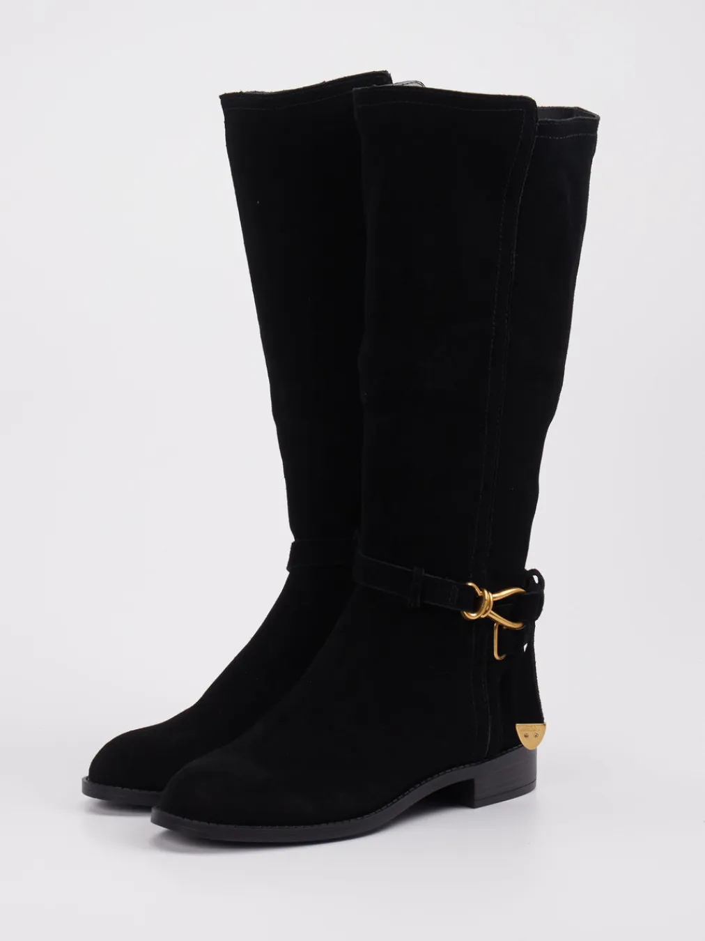 Diese kniehohen Damenstiefel vereinen klassisch-elegantes Design mit minimalistischer Reitstiefel-Anmutung und setzen durch goldfarbene Details stilvolle Akzente.