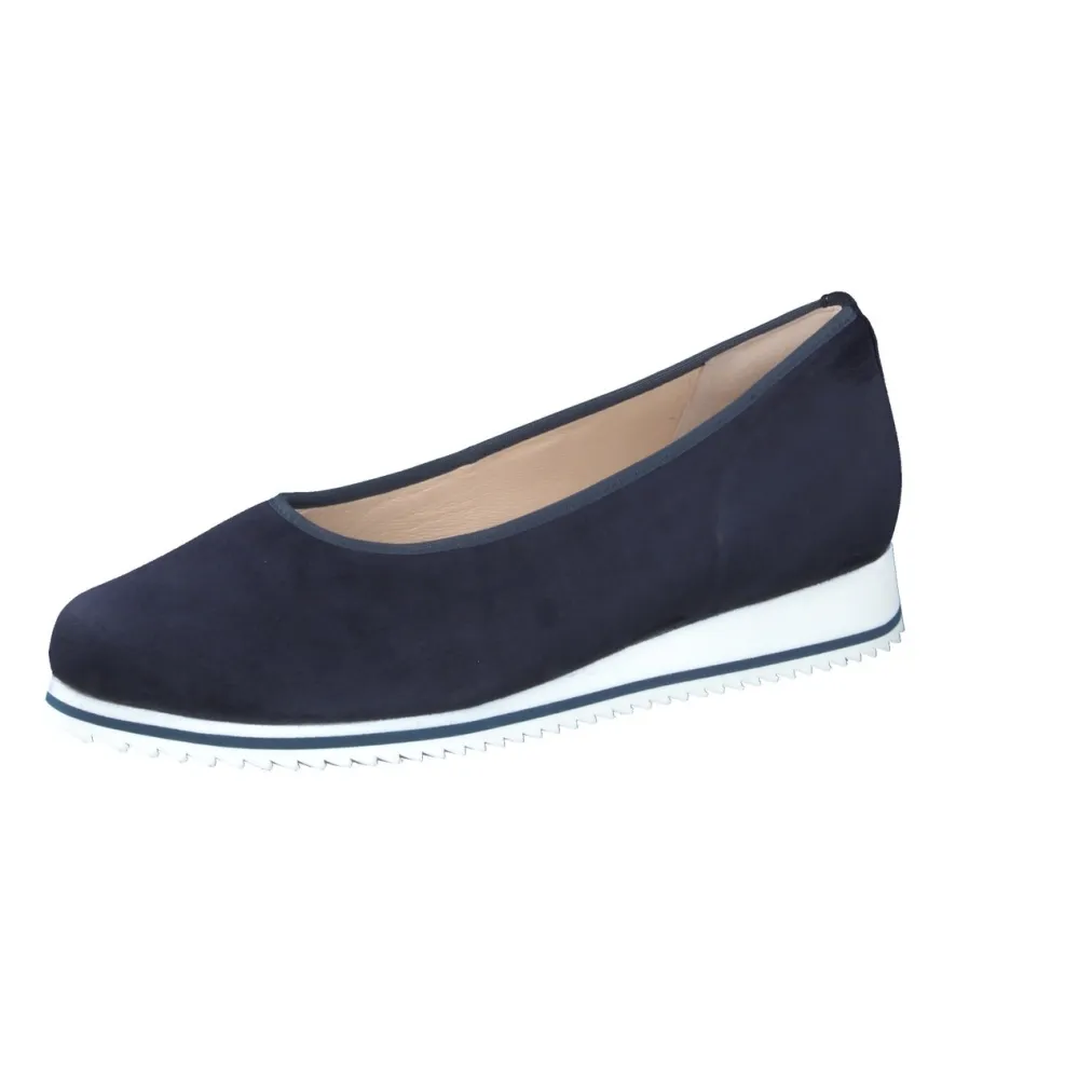 Smarte Leichtigkeit für jede Gelegenheit. Der Damen-Komfort-Ballerina von Hassia überzeugt mit ausgewogenem Design und ergonomischem Fußkomfort. Ob im Büro oder beim Stadtbummel – das dunkelblaue Veloursleder schmiegt sich weich an. Die matte Oberfläche wirkt zurückhaltend elegant, während die weiße Kontrastsohle mit dunkelblauer Linie einen modernen Akzent setzt. Die klassisch flache Silhouette und das gepolsterte Wechselfußbett sorgen für anhaltendes Tragegefühl. Rutschfeste Profilierung und elastische Paspelierung runden das Konzept ab und betonen den Look zwischen „Quiet Luxury“ und Soft-Comfort-Trend. Maximaler Tragekomfort von Hassia – präzise umgesetzt bis ins Detail.