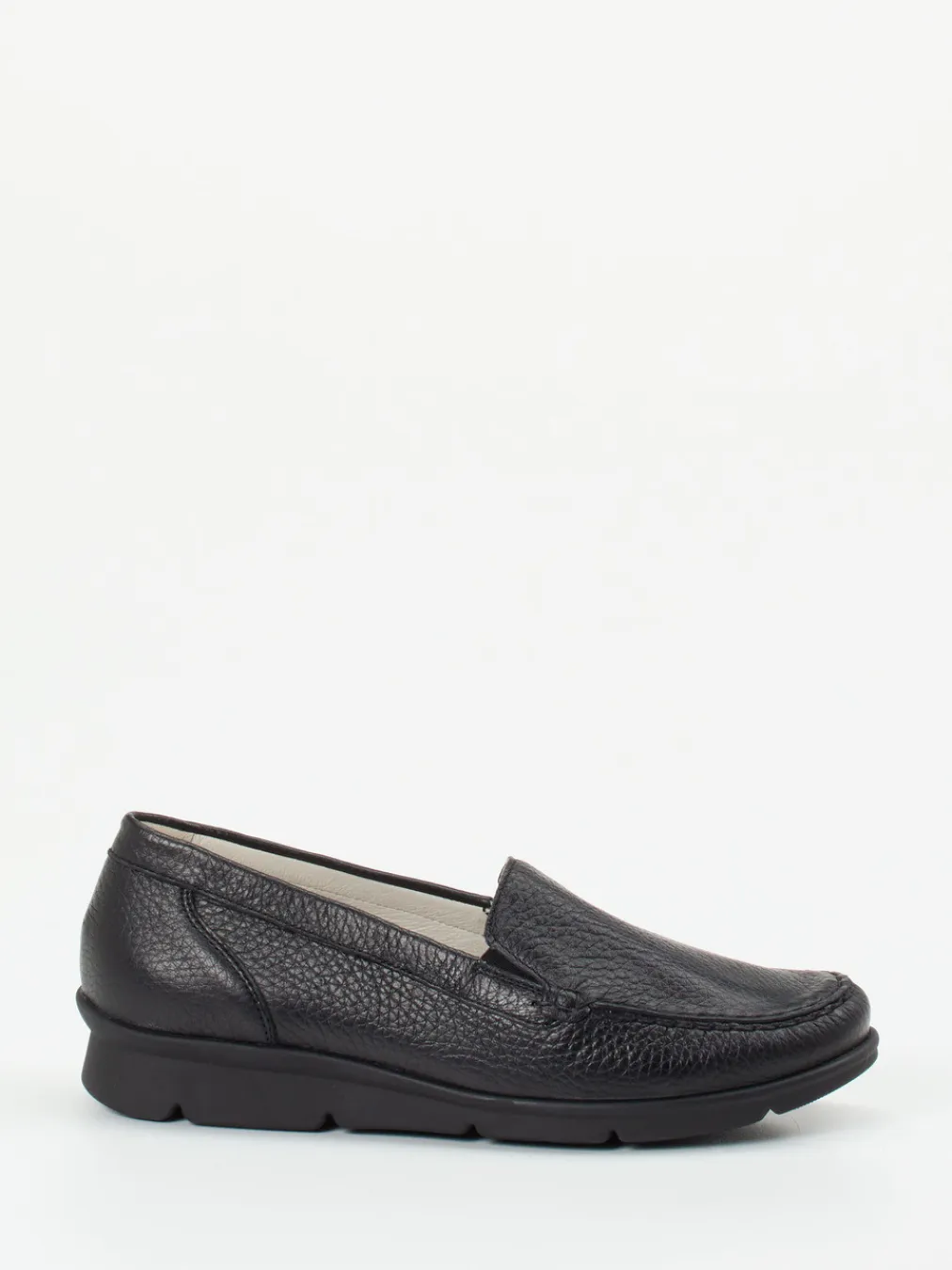 Perfekt bei langen Tagen, bietet das weiche, genarbte Elchleder ein wertiges Tragegefühl und passt sich angenehm dem Fuß an. Die klassische Mokassinnaht unterstreicht die flache, minimalistische Form in dezentem Schwarz. Dank seitlicher Elastikeinsätze wird das An- und Ausziehen erleichtert. Die profilierte Luftpolstersohle wirkt stoßdämpfend und verleiht Stabilität auf jedem Untergrund. Ein herausnehmbares Fußbett bietet Raum für individuelle Einlagen. Die Gestaltung folgt dem Trend ‚Quiet Luxury‘ – unaufdringlich, komfortorientiert, stilvoll kombinierbar.