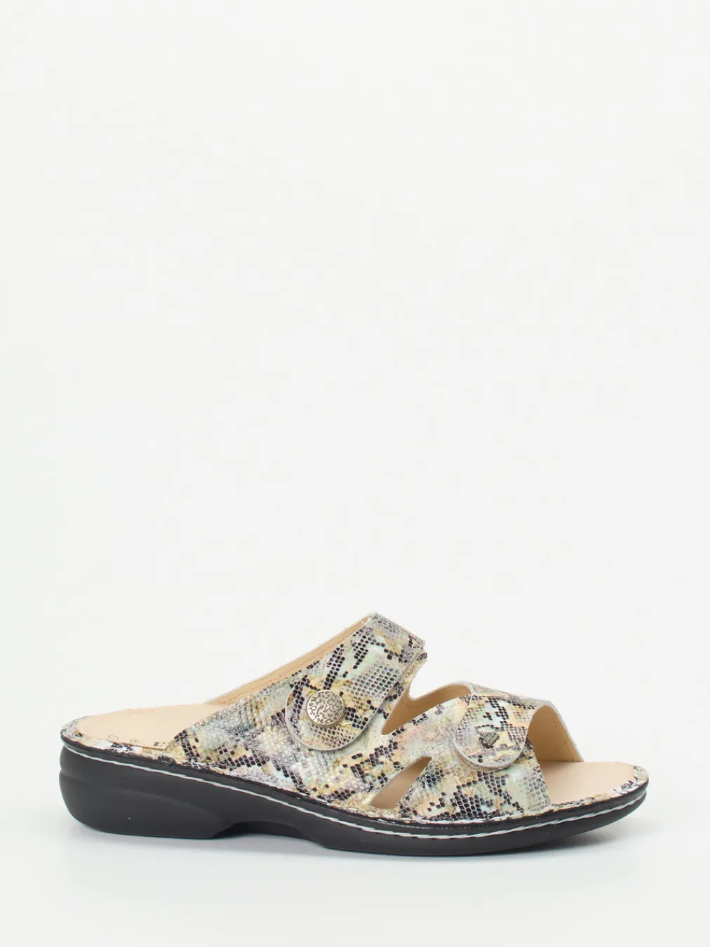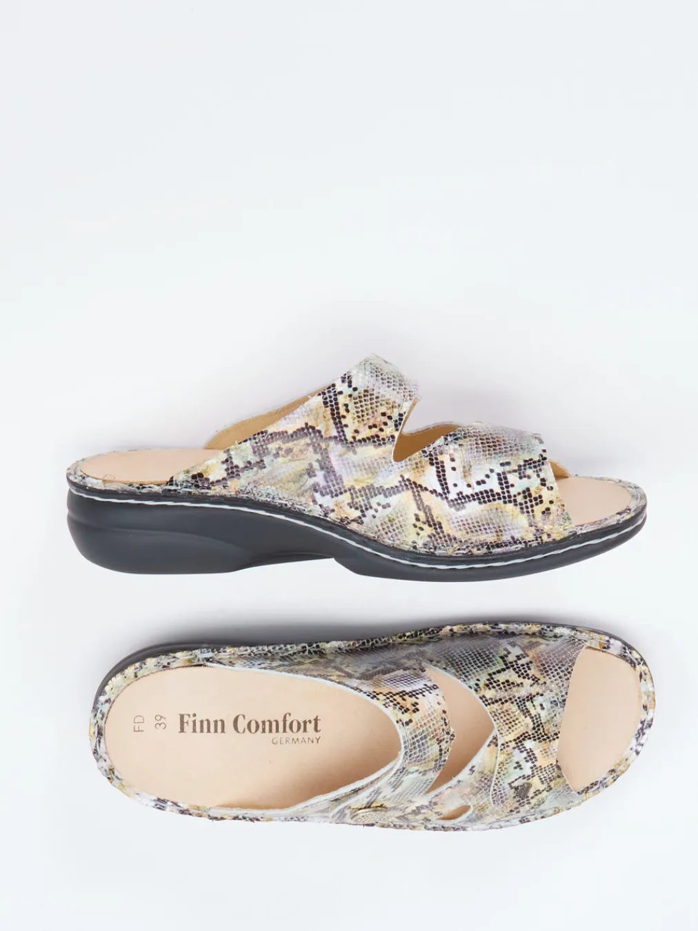 Stilsicher entspannen im Sommer.Finn Comfort präsentiert mit dieser Komfort-Pantolette ein durchdachtes Modell für Alltag und Freizeit. Die ergonomisch geformte Pantolette aus geprägtem Leder mit Pythonoptik überzeugt durch eine genarbte Oberfläche in multicolor, ergänzt durch silberfarbene Dekoelemente und kontrastierende Nähte. Zwei Klettverschlüsse ermöglichen eine flexible Passform, das herausnehmbare Fußbett unterstützt orthopädische Einlagen. Die schwarze PU-Sohle ist rutschhemmend und läuft leicht federnd. Reptil-Optik und Komfort-Design verbinden sich zu einem stilvollen Alltagsbegleiter für modebewusste Trägerinnen. Finn Comfort steht dabei für höchste Ergonomie und handwerkliche Sorgfalt.